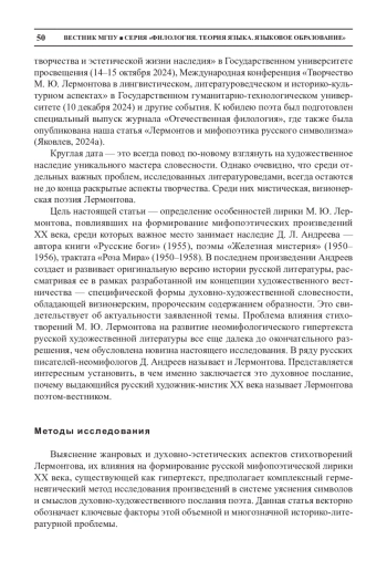 Статья: М. Ю. ЛЕРМОНТОВ И МИФОПОЭТИЧЕСКАЯ КОНЦЕПЦИЯ ВЕСТНИЧЕСТВА Д. Л. АНДРЕЕВА (2025)