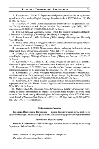 16. Катермина, В. В., & Липириди, С. Х. (2021). Прагматико-аксиологический потенциал сетевых английских неологизмов туристического дискурса. Кубанский государственный университет. EDN: ZZCSFN