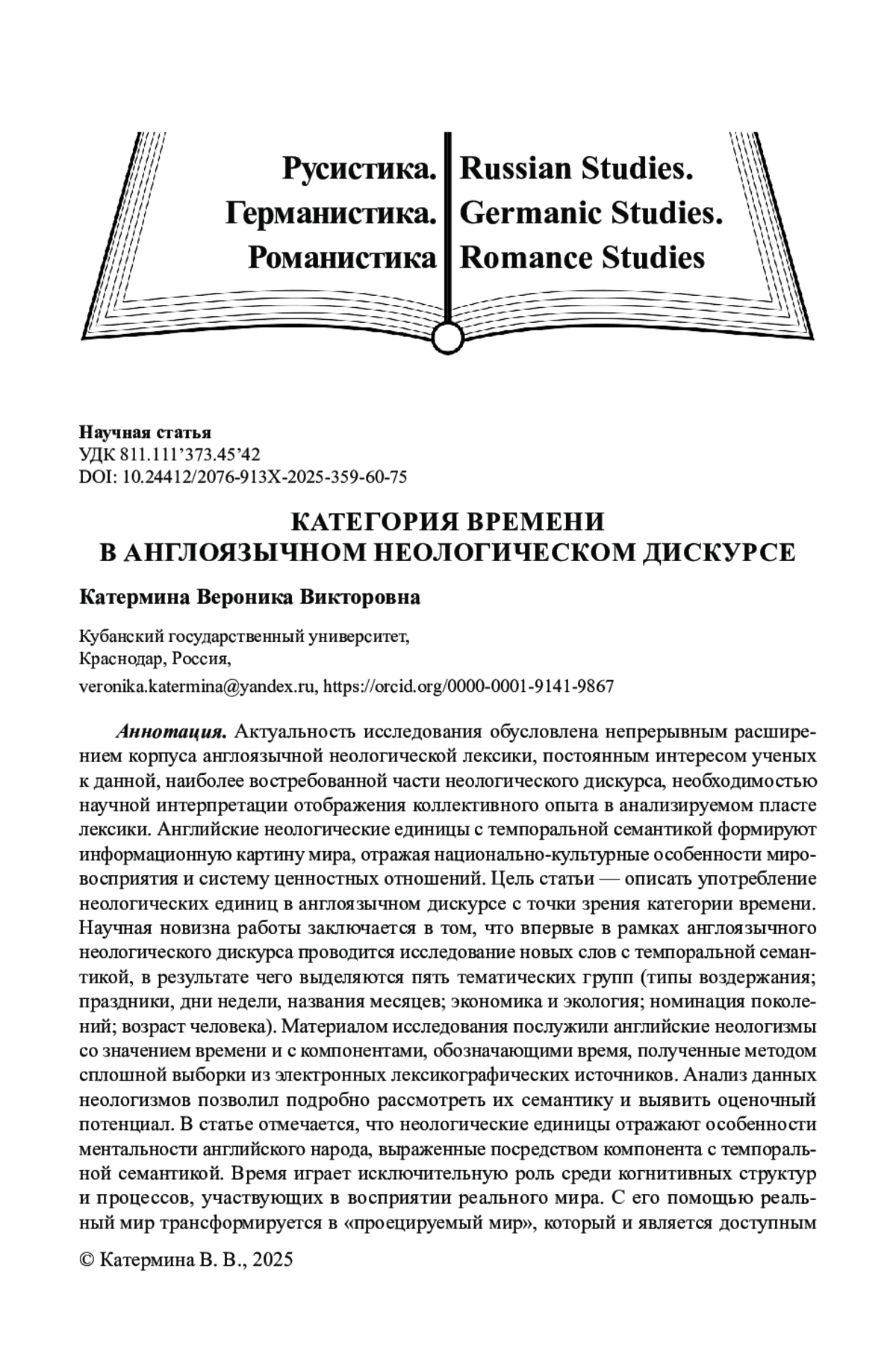Актуальность исследования обусловлена непрерывным расширением корпуса англоязычной неологической лексики, постоянным интересом ученых к данной, наиболее востребованной части неологического дискурса, необходимостью научной интерпретации отображения коллективного опыта в анализируемом пласте лексики. Английские неологические единицы с темпоральной семантикой формируют информационную картину мира, отражая национально-культурные особенности мировосприятия и систему ценностных отношений. Цель статьи - описать употребление неологических единиц в англоязычном дискурсе с точки зрения категории времени. Научная новизна работы заключается в том, что впервые в рамках англоязычного неологического дискурса проводится исследование новых слов с темпоральной семантикой, в результате чего выделяются пять тематических групп (типы воздержания; праздники, дни недели, названия месяцев; экономика и экология; номинация поколений; возраст человека). Материалом исследования послужили английские неологизмы со значением времени и с компонентами, обозначающими время, полученные методом сплошной выборки из электронных лексикографических источников. Анализ данных неологизмов позволил подробно рассмотреть их семантику и выявить оценочный потенциал. В статье отмечается, что неологические единицы отражают особенности ментальности английского народа, выраженные посредством компонента с темпоральной семантикой. Время играет исключительную роль среди когнитивных структур и процессов, участвующих в восприятии реального мира. С его помощью реальный мир трансформируется в «проецируемый мир», который и является доступным человеческому сознанию. В работе применялись такие методы научного познания, как анализ литературы, обобщение опыта, классификация и дедукция. Образование и существование данных неологических единиц в англоязычном дискурсе говорит об их значимости при отражении национально-культурных особенностей мировосприятия и системы ценностных отношений.