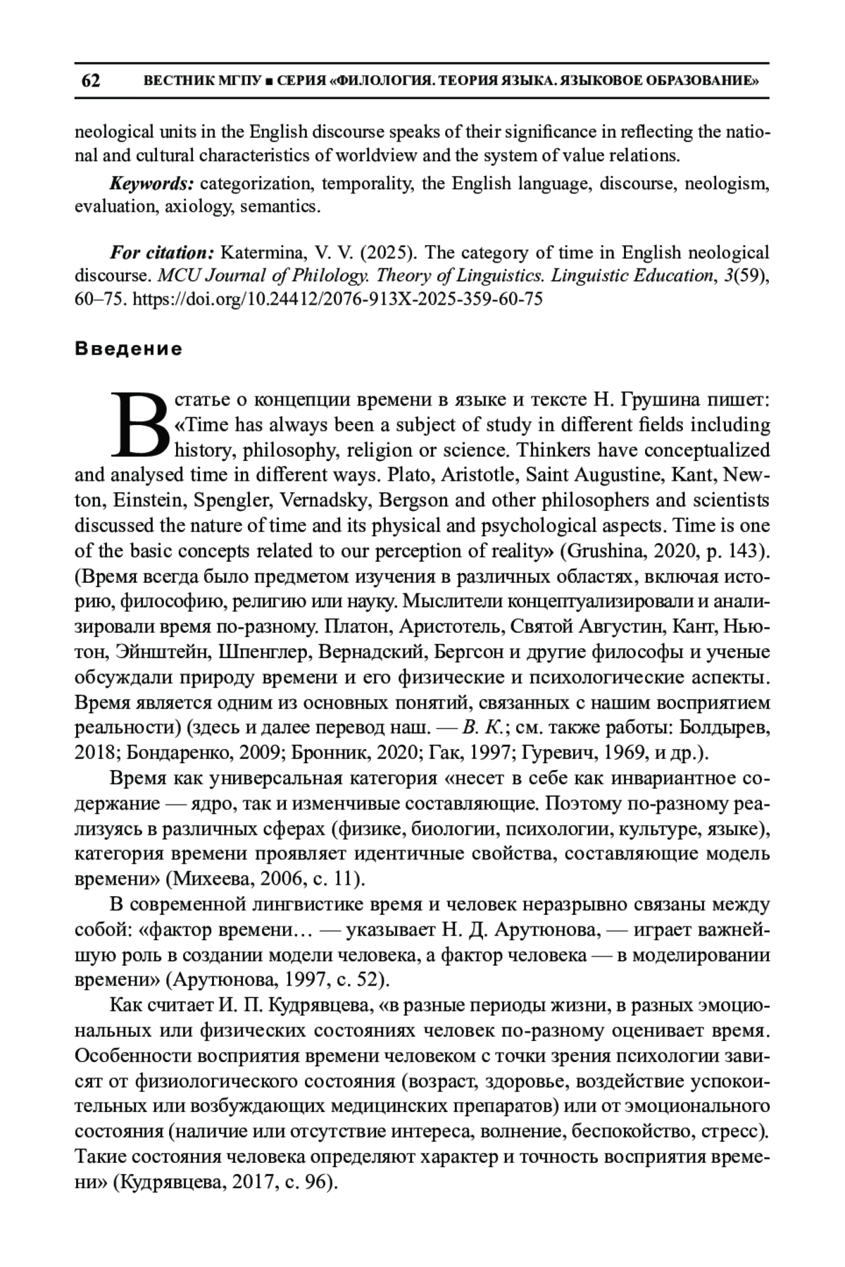 В статье о концепции времени в языке и тексте Н. Грушина пишет: «Time has always been a subject of study in different fields including history, philosophy, religion or science. Thinkers have conceptualized and analysed time in different ways. Plato, Aristotle, Saint Augustine, Kant, Newton, Einstein, Spengler, Vernadsky, Bergson and other philosophers and scientists discussed the nature of time and its physical and psychological aspects. Time is one of the basic concepts related to our perception of reality» (Grushina, 2020, p. 143).