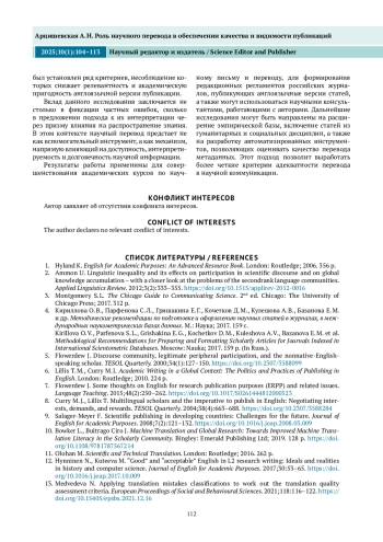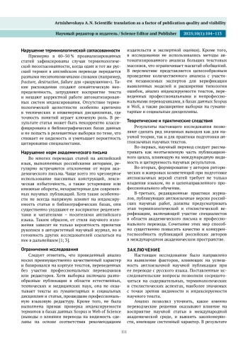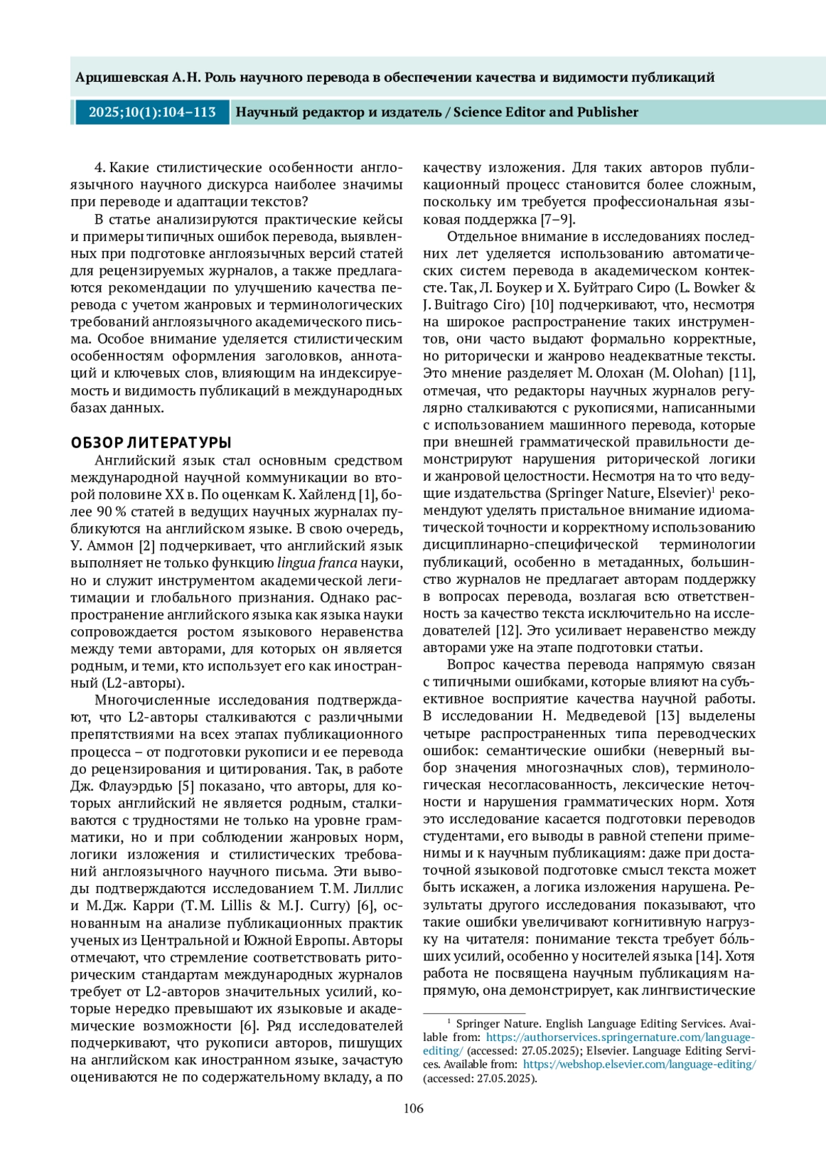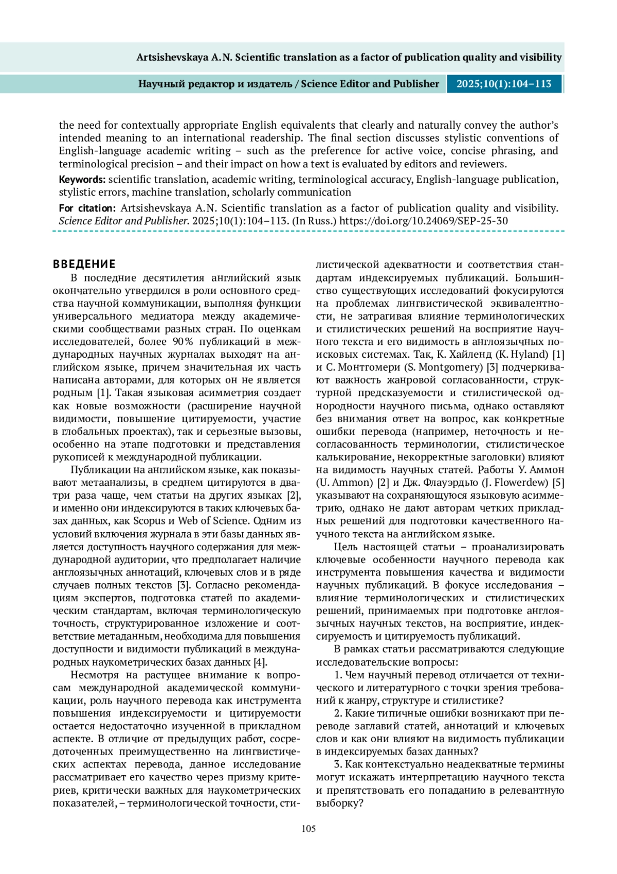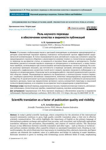АРЦИШЕВСКАЯ А. Н. РОЛЬ НАУЧНОГО ПЕРЕВОДА В ОБЕСПЕЧЕНИИ КАЧЕСТВА И ВИДИМОСТИ ПУБЛИКАЦИЙ // НАУЧНЫЙ РЕДАКТОР И ИЗДАТЕЛЬ. 2025. № 1, ТОМ 10