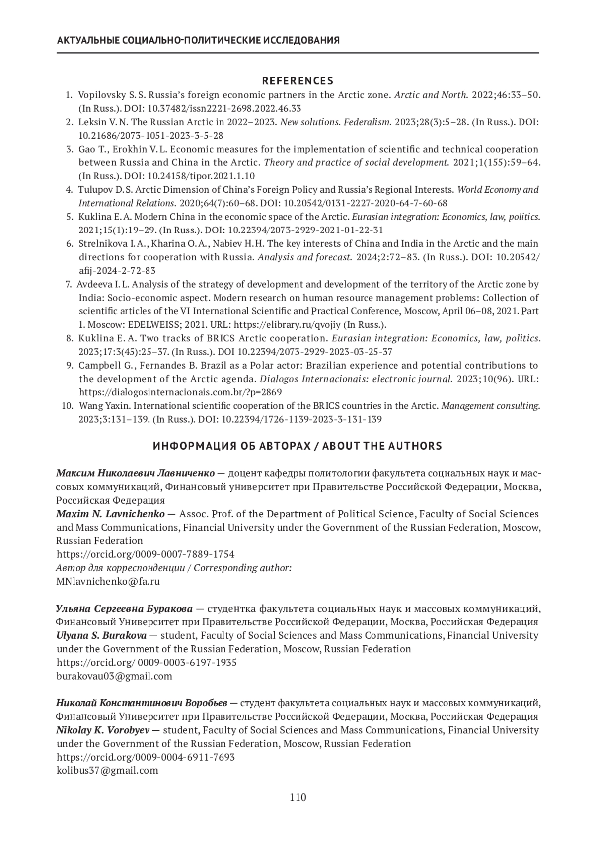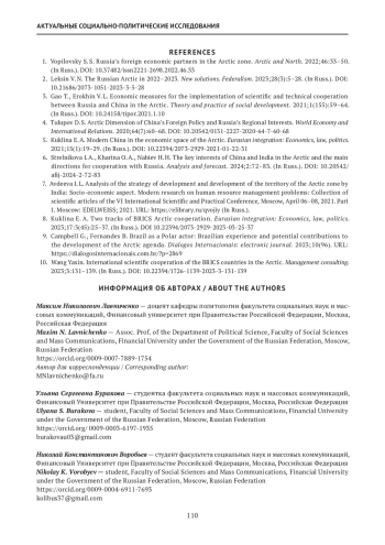 8. Куклина Е. А. Два трека арктического сотрудничества БРИКС. Евразийская интеграция: экономика, право, политика. 2023;17:3(45):25-37. https://doi.org/10.22394/2073-2929-2023-03-25-37