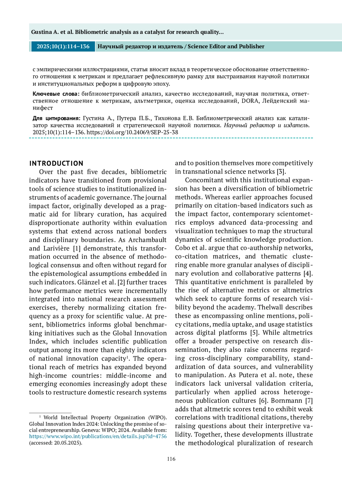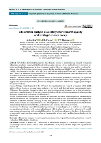 Введение. Библиометрические практики заняли центральное место в современной оценке исследований, влияя на академические карьеры, институциональные рейтинги и национальную научную политику. Однако их неселективное применение вызывает серьезные опасения, связанные с вопросами справедливости, эпистемологической предвзятости и размывания академических ценностей. Несмотря на то что инициативы по реформированию ответственного отношения к метрикам, такие как Лейденский манифест и DORA, получили международное признание, интеграция их принципов в институциональные и национальные рамки остается непоследовательной. В данной статье рассматривается неразрешенное противоречие между глобальным дискурсом об ответственном отношении к метрикам и его неравномерной операционализацией в разных контекстах. Цель. Исследование представляет концептуальный анализ управления библиометрией, выдвигая аргумент о необходимости переосмысления исследовательских метрик как интегрированных инструментов многоуровневого научного управления. Метод. Для обоснования теоретической позиции, авторы использовали иллюстративное библиометрическое картирование и интерпретативный синтез политики в сфере библиометрической оценки исследований и академической карьеры. В программе VOSviewer был выполнен анализ со-встречаемости ключевых слов и терминов на основе массива из 500 наиболее цитируемых публикаций по теме библиометрической оценки исследований (2015–2024 гг.), извлеченных из базы данных Scopus. Полученные тематические кластеры анализировались не как эмпирическое доказательство, а как интеллектуальные ориентиры для концептуальной дискуссии. Интерпретация материалов осуществлялась путем сопоставления с ключевыми документами в области библиометрической оценки исследований и с реформаторскими повестками научной политики, при этом аналитическая рамка опиралась на концептуально ориентированный подход. Результаты. Библиометрическая визуализация выявила фрагментированность дискурса: нормативные рамки ответственного использования метрик концептуально обозначены, но слабо интегрированы в литературу, ориентированную на оценку эффективности научной деятельности. Описанные национальные кейсы (Китай, Италия, Индонезия) позволили усилить иллюстрацию расхождения между политической риторикой и практической реализацией. В статье предлагается многоуровневая концептуальная модель «метрической ответственности», охватывающая индивидуальное, институциональное и национальное измерения реформ в сфере оценки научной деятельности. Выводы. Полученные результаты подтверждают необходимость управления метриками на основе принципов баланса: количественные показатели должны сочетаться с контекстуальной экспертизой, этической рефлексией и согласованностью политик. Комбинируя концептуальное рассуждения с эмпирическими иллюстрациями, статья вносит вклад в теоретическое обоснование ответственного отношения к метрикам и предлагает рефлексивную рамку для выстраивания научной политики и институциональных реформ в цифровую эпоху.