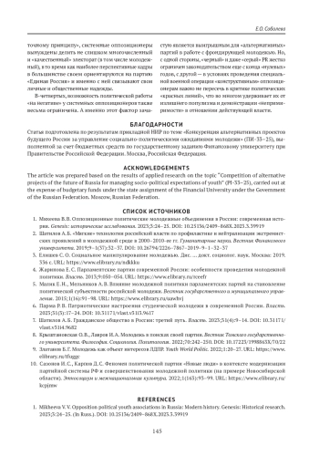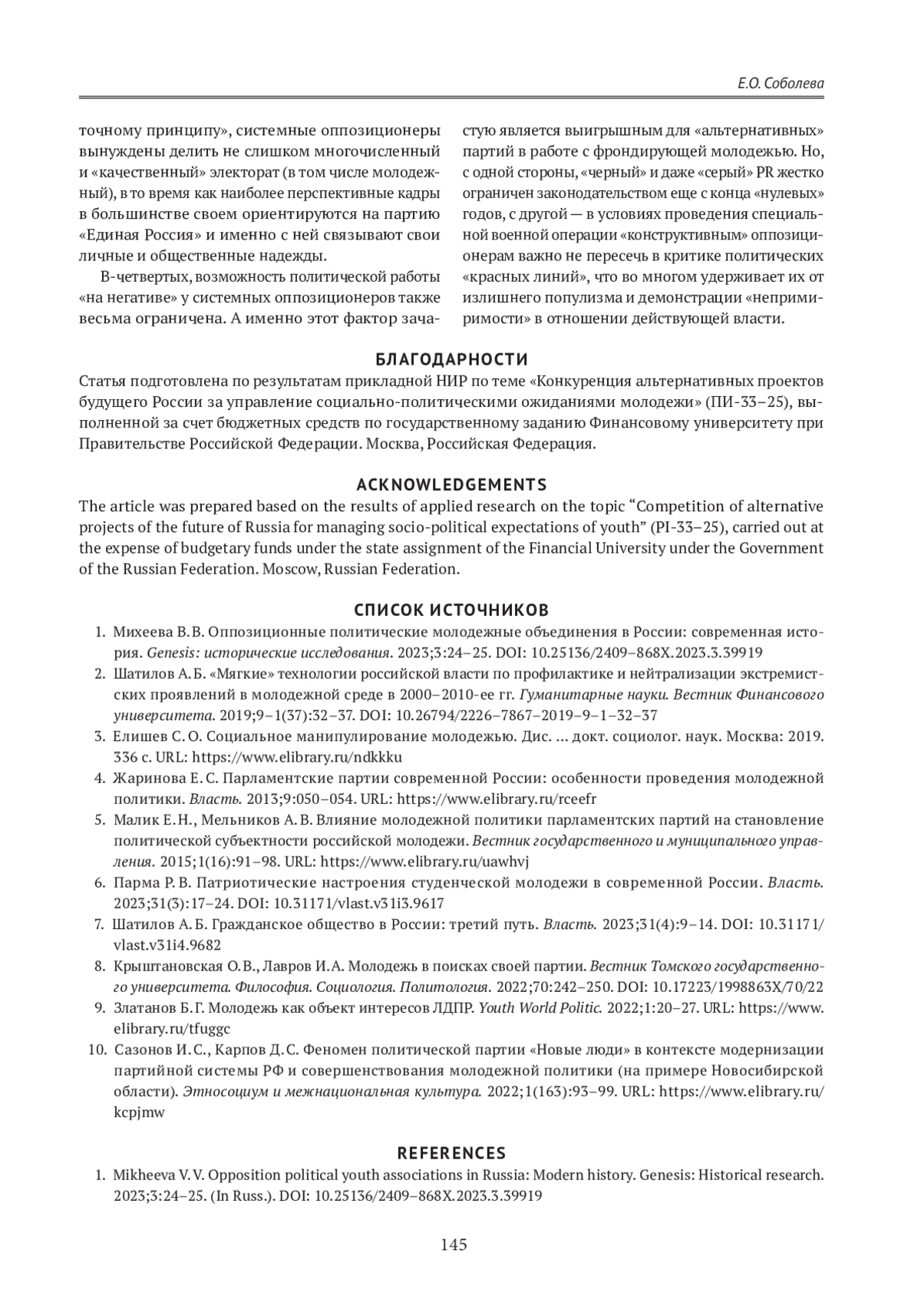 1. Михеева В. В. Оппозиционные политические молодежные объединения в России: современная история. Genesis: исторические исследования. 2023;3:24-25. https://doi.org/10.25136/2409-868X.2023.3.39919