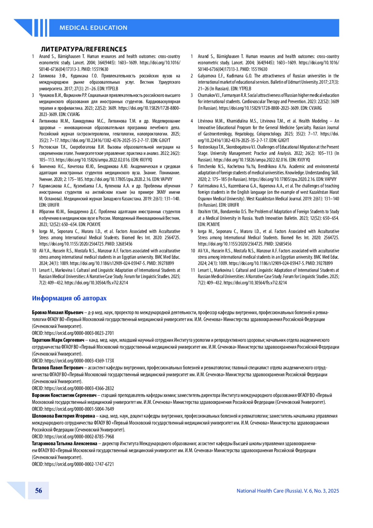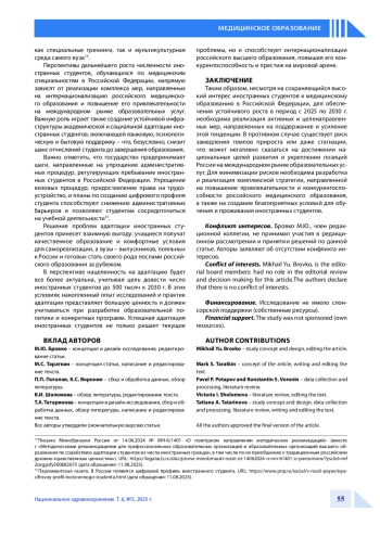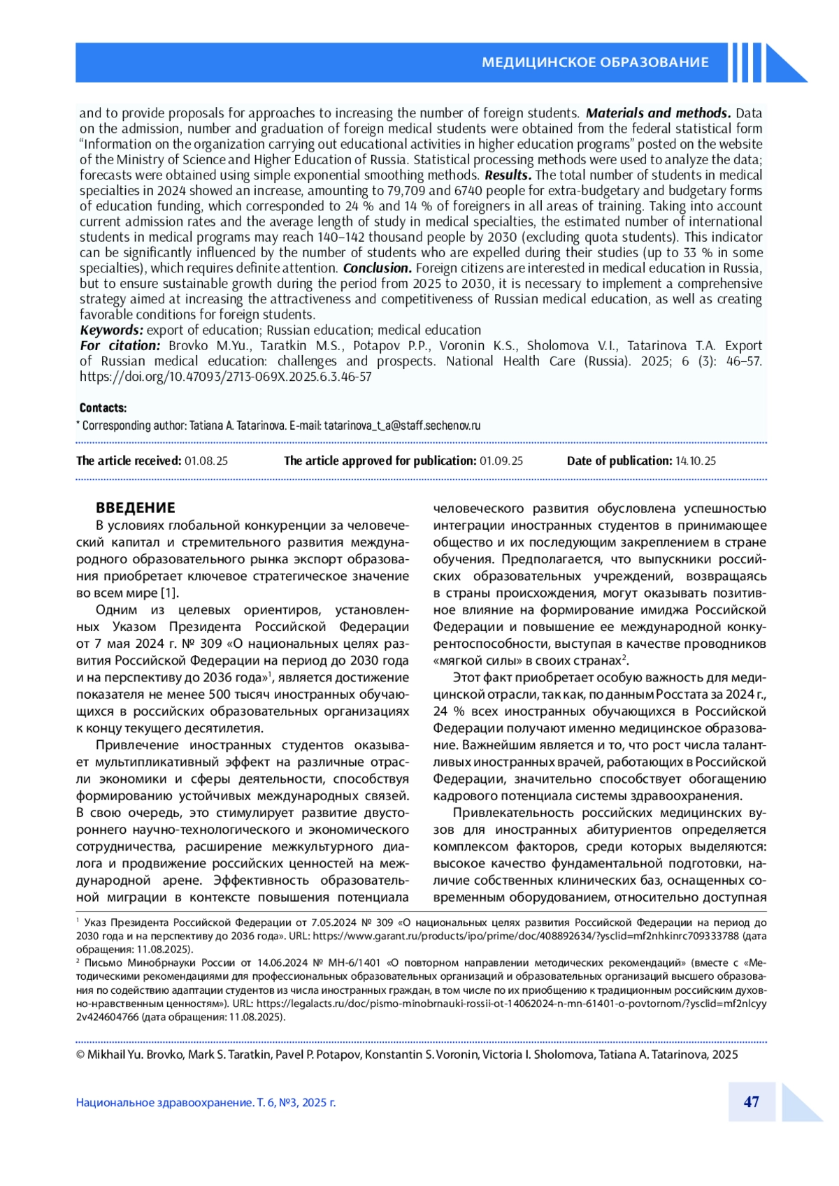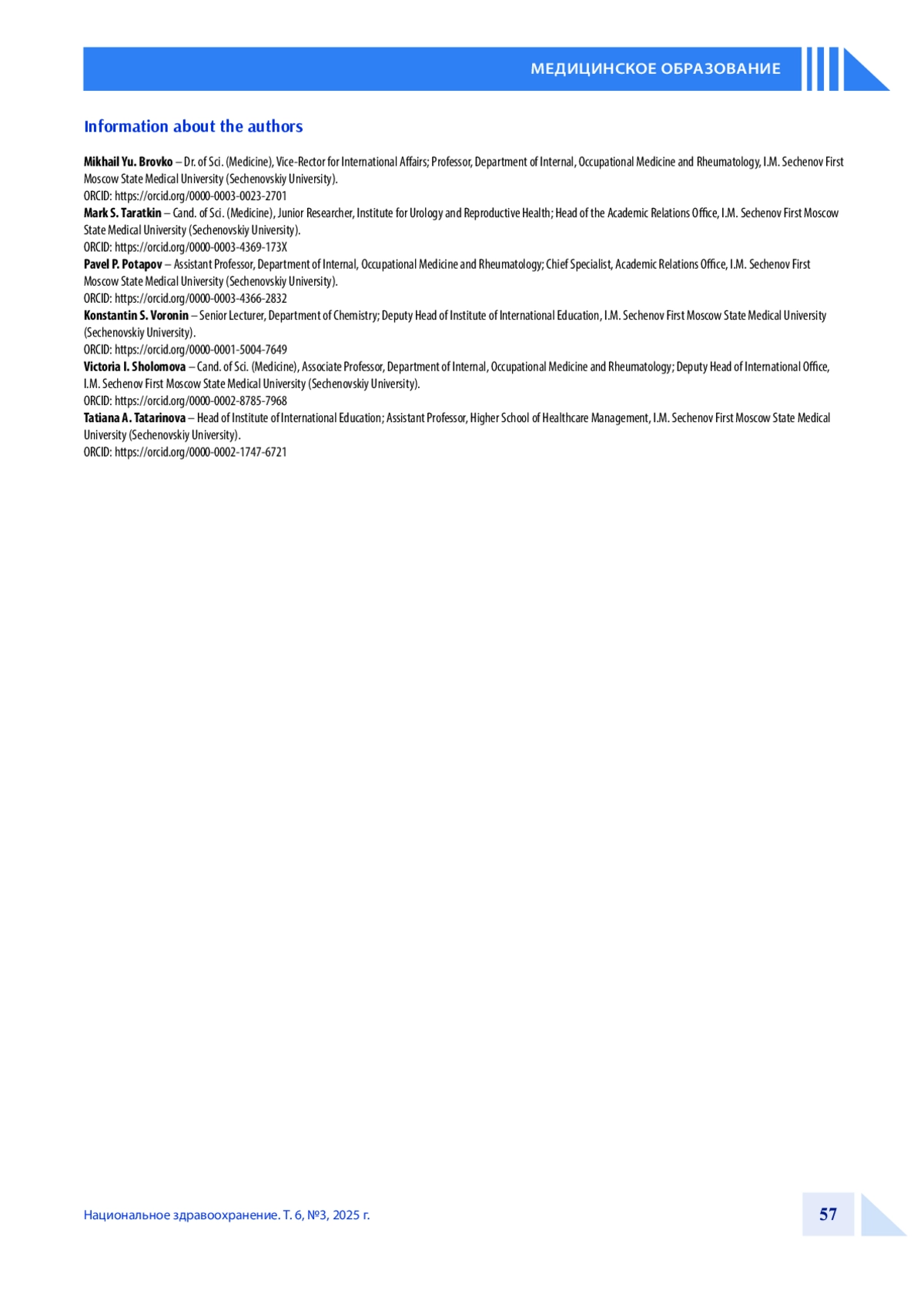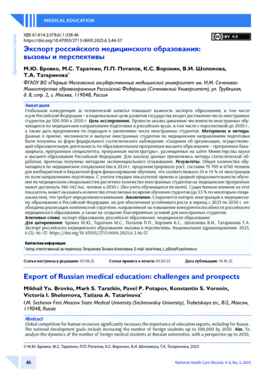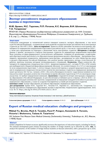 БРОВКО М. Ю., ТАРАТКИН М. С., ПОТАПОВ П. П., ВОРОНИН К. С., ШОЛОМОВА В. И., ТАТАРИНОВА Т. А. ЭКСПОРТ РОССИЙСКОГО МЕДИЦИНСКОГО ОБРАЗОВАНИЯ: ВЫЗОВЫ И ПЕРСПЕКТИВЫ // НАЦИОНАЛЬНОЕ ЗДРАВООХРАНЕНИЕ. 2025. № 3, ТОМ 6