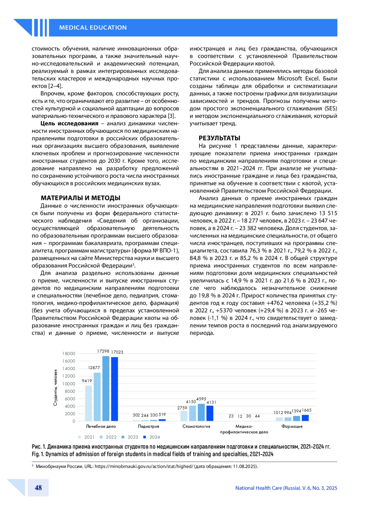 Глобальная конкуренция за человеческий капитал повышает важность экспорта образования, в том числе и для Российской Федерации – в национальные цели развития государства входит достижение числа иностранных студентов до 500 000 к 2030 г. Цель исследования. Провести анализ динамики численности иностранных обучающихся по медицинским направлениям подготовки в российских вузах, в том числе с перспективой до 2030 г., а также дать предложения по подходам к увеличению числа иностранных студентов. Материалы и методы. Данные о приеме, численности и выпуске иностранных студентов по медицинским направлениям подготовки были получены из форм федерального статистического наблюдения «Сведения об организации, осуществляющей образовательную деятельность по образовательным программам высшего образования – программам бакалавриата, программам специалитета, программам магистратуры», размещенных на сайте Министерства науки и высшего образования Российской Федерации. Для анализа данных применялись методы статистической обработки; прогнозы получены методами экспоненциального сглаживания. Результаты. Общее количество обучающихся по медицинским специальностям в 2024 г. продемонстрировало рост, составив 79 709 и 6740 человек для внебюджетной и бюджетной форм финансирования обучения, что соответствовало 24 и 14 % от иностранцев по всем направлениям подготовки. С учетом текущих показателей приема и средней продолжительности обучения по медицинским специальностям расчетное количество иностранных студентов на медицинских программах может достигнуть 140–142 тыс. человек к 2030 г. (без учета обучающихся по квоте). Существенное влияние на этот показатель может оказывать количество отчисляемых во время обучения студентов (до 33 % по некоторым специальностям), что требует определенного внимания. Заключение. Сохраняется интерес иностранцев к медицинскому образованию в Российской Федерации, но для обеспечения устойчивого роста в период с 2025 по 2030 г. необходима реализация комплексной стратегии, направленной на повышение конкурентоспособности российского медицинского образования, а также на создание благоприятных условий для иностранных студентов.