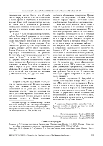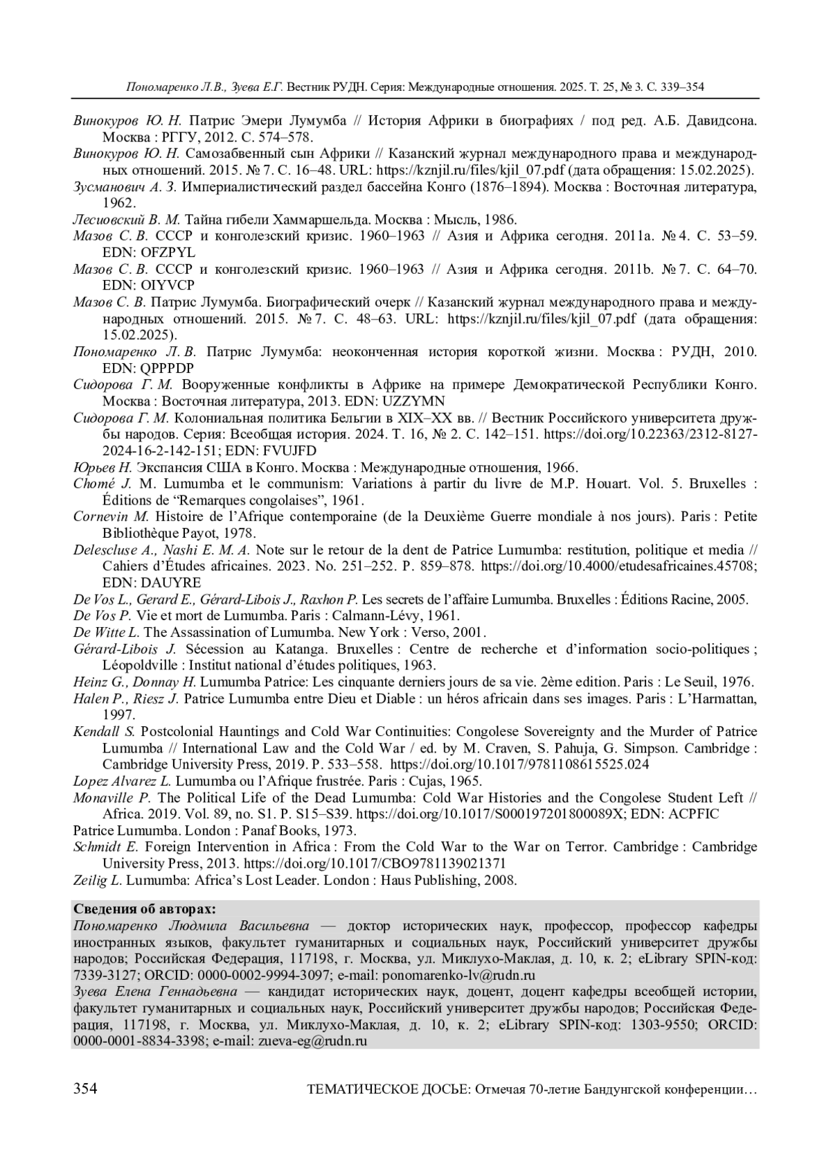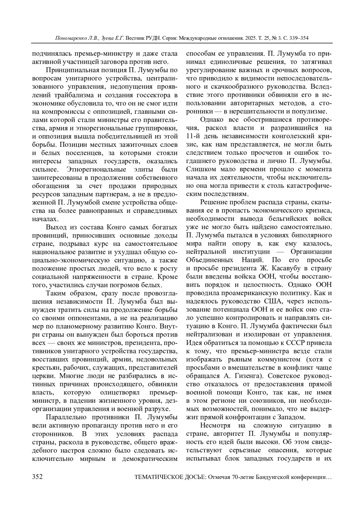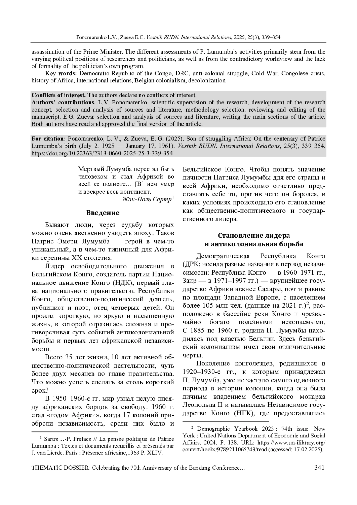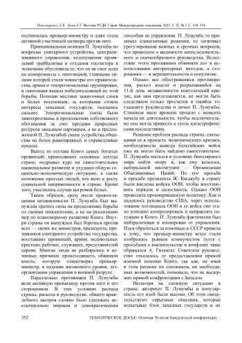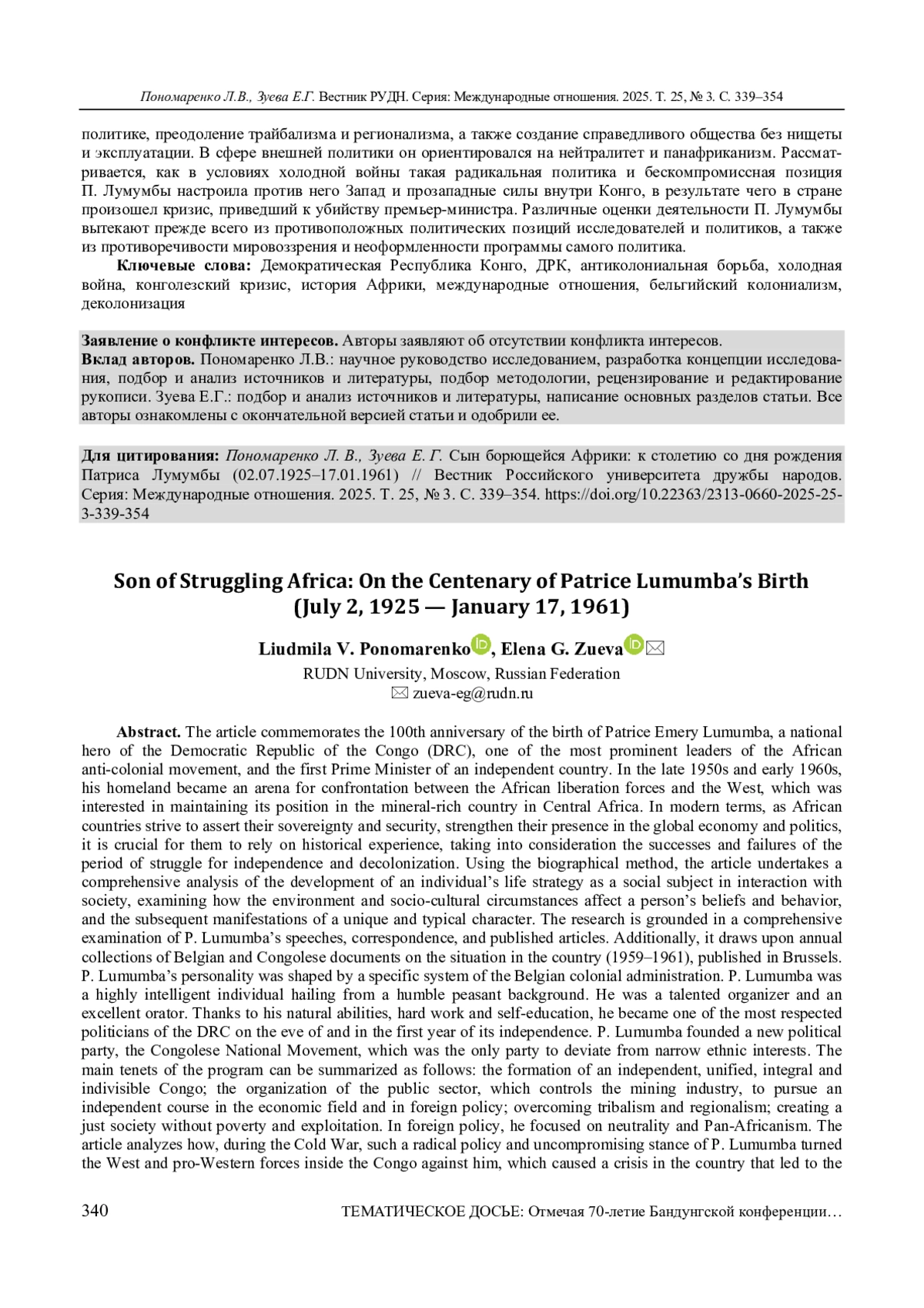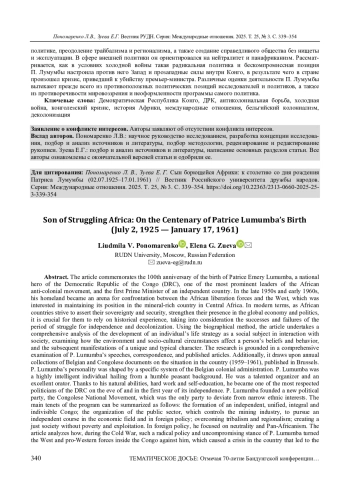Статья посвящена 100-летию со дня рождения Патриса Эмери Лумумбы - национального героя Демократической Республики Конго (ДРК), одного из ярчайших лидеров африканского антиколониального движения, первого премьер-министра независимой страны. В конце 1950-х - начале 1960-х гг. его родина превратилась в арену противоборства между африканскими силами освобождения и Западом, заинтересованным в сохранении позиций в богатой минеральными ресурсами стране в Центральной Африке. В современных условиях, когда африканские страны решают актуальные задачи утверждения суверенитета и безопасности, укрепления своего веса в мировой экономике и политике, им важно опираться на исторический опыт, учитывающий достижения и ошибки периода борьбы за независимость и деколонизации. С помощью биографического метода авторы анализируют формирование жизненной стратегии отдельного человека как социального актора во взаимодействии с обществом, выявляя, каким образом среда и социокультурные обстоятельства влияют на личность, ее убеждения и поведение, проявления уникального и типичного в характере. Источниковую базу исследования составили выступления, письма, статьи П. Лумумбы, издававшиеся в Брюсселе ежегодные сборники бельгийских и конголезских документов (1959-1961 гг.) о ситуации в стране. Становление личности П. Лумумбы происходило в условиях специфической системы бельгийского колониального управления. Яркий самородок из бедной крестьянской семьи, талантливый организатор, прекрасный оратор благодаря природным способностям, трудолюбию и самообразованию стал одним из самых авторитетных политиков ДРК накануне и в первый год ее независимости, создав единственную политическую партию, отошедшую от узко этнических интересов, - Национальное движение Конго (НДК). Основными положениями его программы были образование независимого, единого, целостного и неделимого Конго, организация государственного сектора, контролирующего горнодобывающую промышленность, для проведения самостоятельного курса в экономической области и во внешней политике, преодоление трайбализма и регионализма, а также создание справедливого общества без нищеты и эксплуатации. В сфере внешней политики он ориентировался на нейтралитет и панафриканизм. Рассматривается, как в условиях холодной войны такая радикальная политика и бескомпромиссная позиция П. Лумумбы настроила против него Запад и прозападные силы внутри Конго, в результате чего в стране произошел кризис, приведший к убийству премьер-министра. Различные оценки деятельности П. Лумумбы вытекают прежде всего из противоположных политических позиций исследователей и политиков, а также из противоречивости мировоззрения и неоформленности программы самого политика.