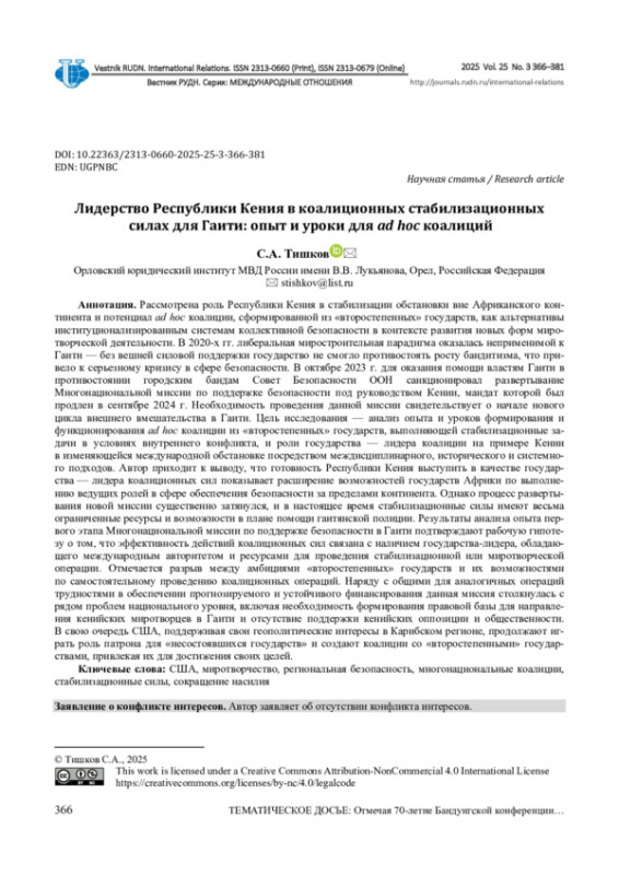 Цель исследования - анализ опыта и уроков формирования и функционирования ad hoc коалиции из «второстепенных» государств, выполняющей стабилизационные задачи в условиях внутреннего конфликта, и роли государства - лидера коалиции на примере Кении в изменяющейся международной обстановке посредством междисциплинарного, исторического и системного подходов. Автор приходит к выводу, что готовность Республики Кения выступить в качестве государства - лидера коалиционных сил показывает расширение возможностей государств Африки по выполнению ведущих ролей в сфере обеспечения безопасности за пределами континента. Однако процесс развертывания новой миссии существенно затянулся, и в настоящее время стабилизационные силы имеют весьма ограниченные ресурсы и возможности в плане помощи гаитянской полиции. Результаты анализа опыта первого этапа Многонациональной миссии по поддержке безопасности в Гаити подтверждают рабочую гипотезу о том, что эффективность действий коалиционных сил связана с наличием государства-лидера, обладающего международным авторитетом и ресурсами для проведения стабилизационной или миротворческой операции. Отмечается разрыв между амбициями «второстепенных» государств и их возможностями по самостоятельному проведению коалиционных операций. Наряду с общими для аналогичных операций трудностями в обеспечении прогнозируемого и устойчивого финансирования данная миссия столкнулась с рядом проблем национального уровня, включая необходимость формирования правовой базы для направления кенийских миротворцев в Гаити и отсутствие поддержки кенийских оппозиции и общественности. В свою очередь США, поддерживая свои геополитические интересы в Карибском регионе, продолжают играть роль патрона для «несостоявшихся государств» и создают коалиции со «второстепенными» государствами, привлекая их для достижения своих целей.