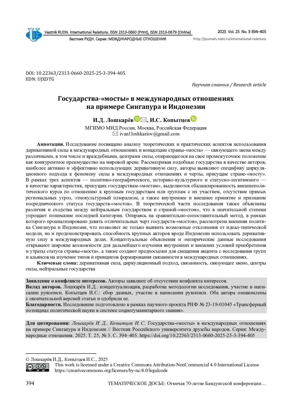 Исследование посвящено анализу теоретических и практических аспектов использования деривативной силы в международных отношениях и концепции страны-«моста» - связующего звена между различными, в том числе и враждебными, центрами силы, опирающегося на свое промежуточное положение как конкурентное преимущество на мировой арене. Рассматривая подобные государства в качестве акторов, наиболее активно и эффективно использующих деривативную силу, авторы выявляют специфику циркуляционного подхода к феномену силы в международных отношениях и черты, присущие стране-«мосту». В рамках трех аспектов - политико - географического, историко-культурного и статусно-легитимного - в качестве характеристик, присущих государствам-«мостам», выделяются сбалансированность внешнеполитического курса по отношению к крупным государствам или группам с их участием, отсутствие прямых региональных угроз, этнокультурный плюрализм, а также внутреннее и внешнее принятие и признание посреднического статуса государств-«мостов». В теоретической части исследования также объяснены различия и сходства между нейтральным государством и страной-«мостом», что в значительной степени упрощает понимание последней категории. Опираясь на сравнительно-сопоставительный метод, в рамках которого проанализировано девять отличительных черт государств-«мостов», рассмотрена внешняя политика Сингапура и Индонезии, что позволяет не только выявить возможные отклонения от идеал-типической модели, но и продемонстрировать способность крупных акторов вроде Индонезии использовать деривативную силу в международных делах. Концептуальные объяснения и эмпирические данные исследования открывают широкие возможности для дальнейшего изучения внутренних и внешних условий приобретения и утраты статуса страны-«моста», а также создают предпосылки для смещения акцента с исследования групп и альянсов на изучение типов и принципов формирования связанности в международных отношениях.
