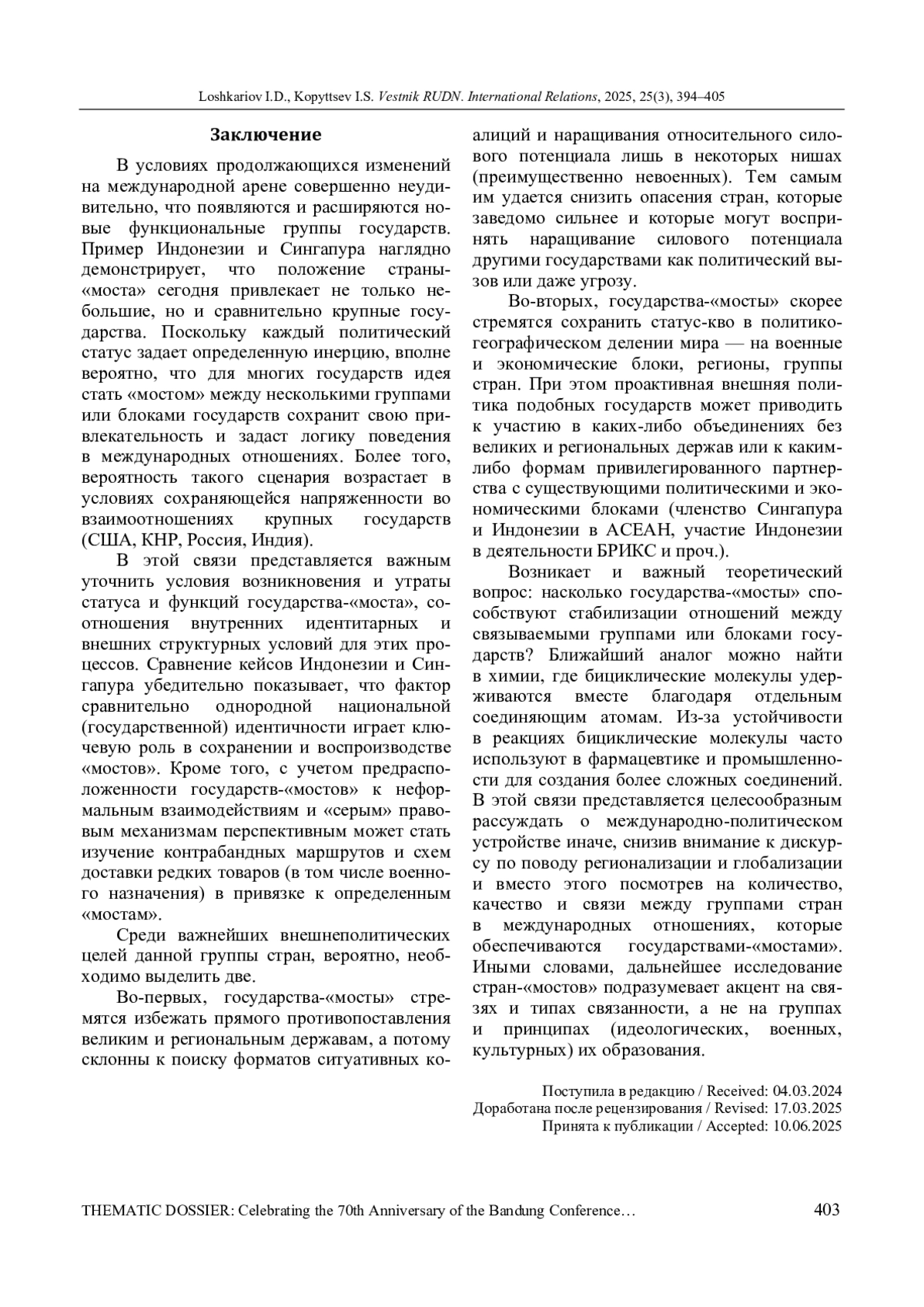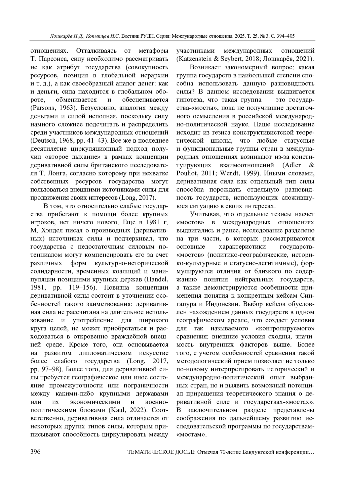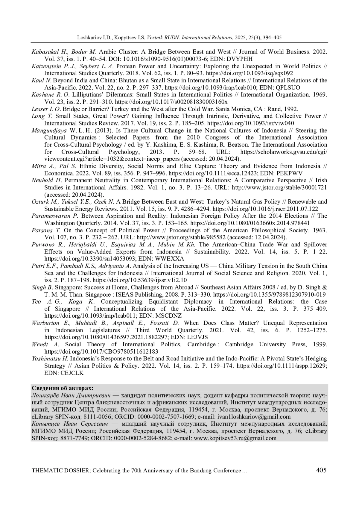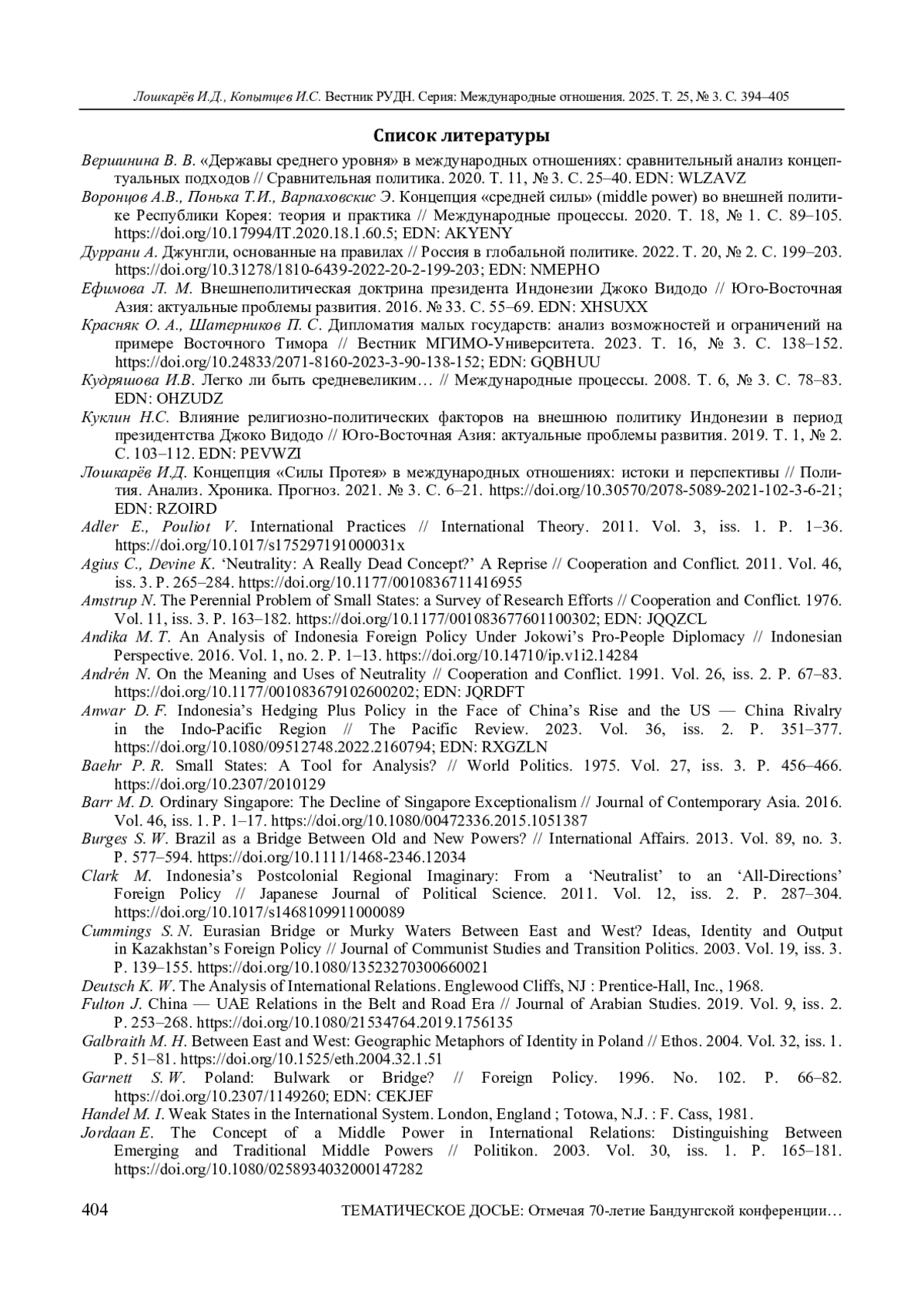 1. Вершинина В. В. “Державы среднего уровня” в международных отношениях: сравнительный анализ концептуальных подходов // Сравнительная политика. 2020. Т. 11, № 3. С. 25-40. EDN: WLZAVZ