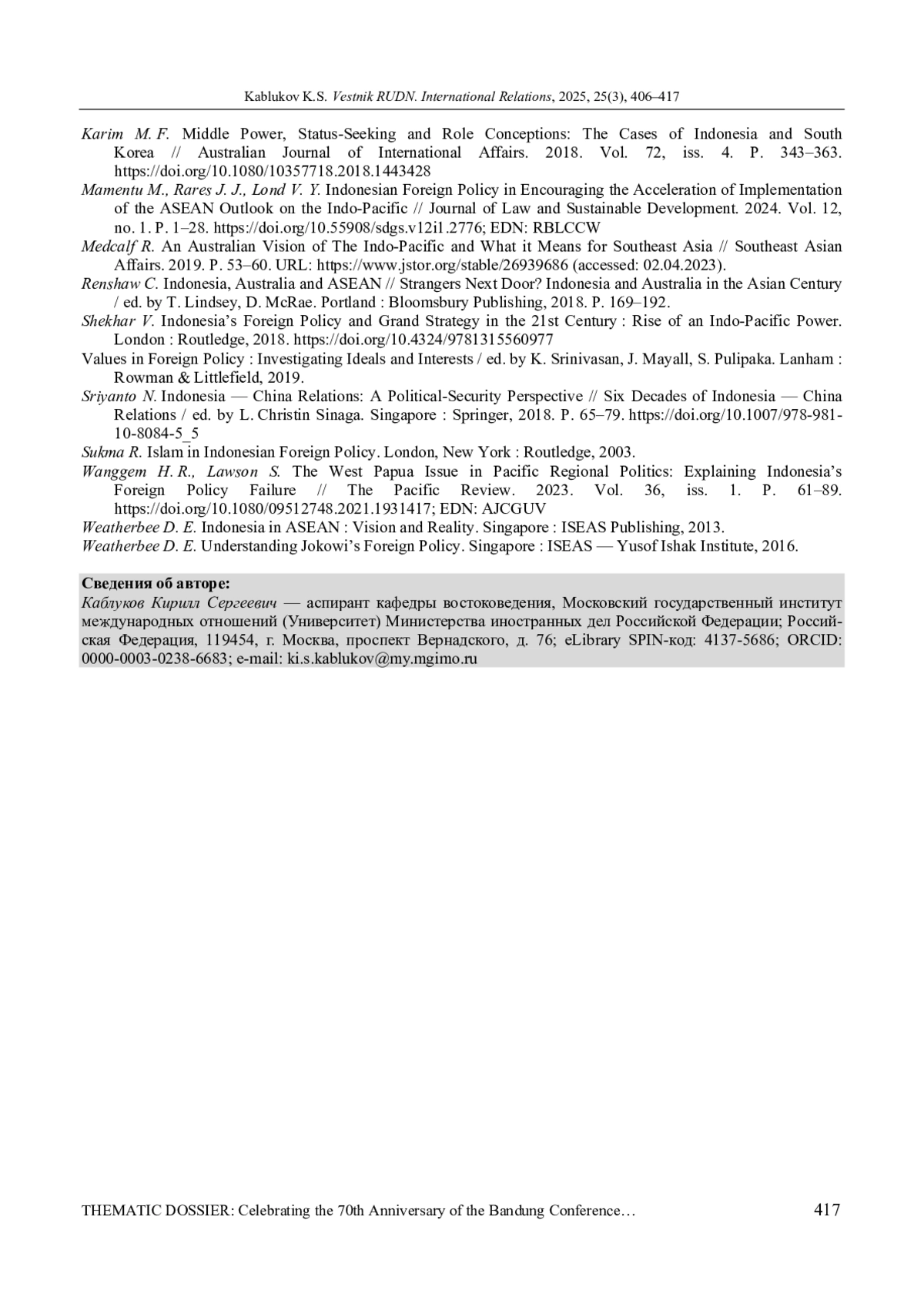 22. Karim M. F. Middle Power, Status-Seeking and Role Conceptions: The Cases of Indonesia and South Korea // Australian Journal of International Affairs. 2018. Vol. 72, iss. 4. P. 343-363. DOI: 10.1080/10357718.2018.1443428