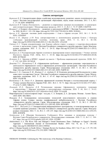 7. Дегтерев Д. А. Ресуверенизация Африки в контексте формирования нового миропорядка // Ученые записки Института Африки РАН. 2024а. № 4. С. 29-48. ;. DOI: 10.31132/2412-5717-2024-69-4-29-48 EDN: KVTKGO