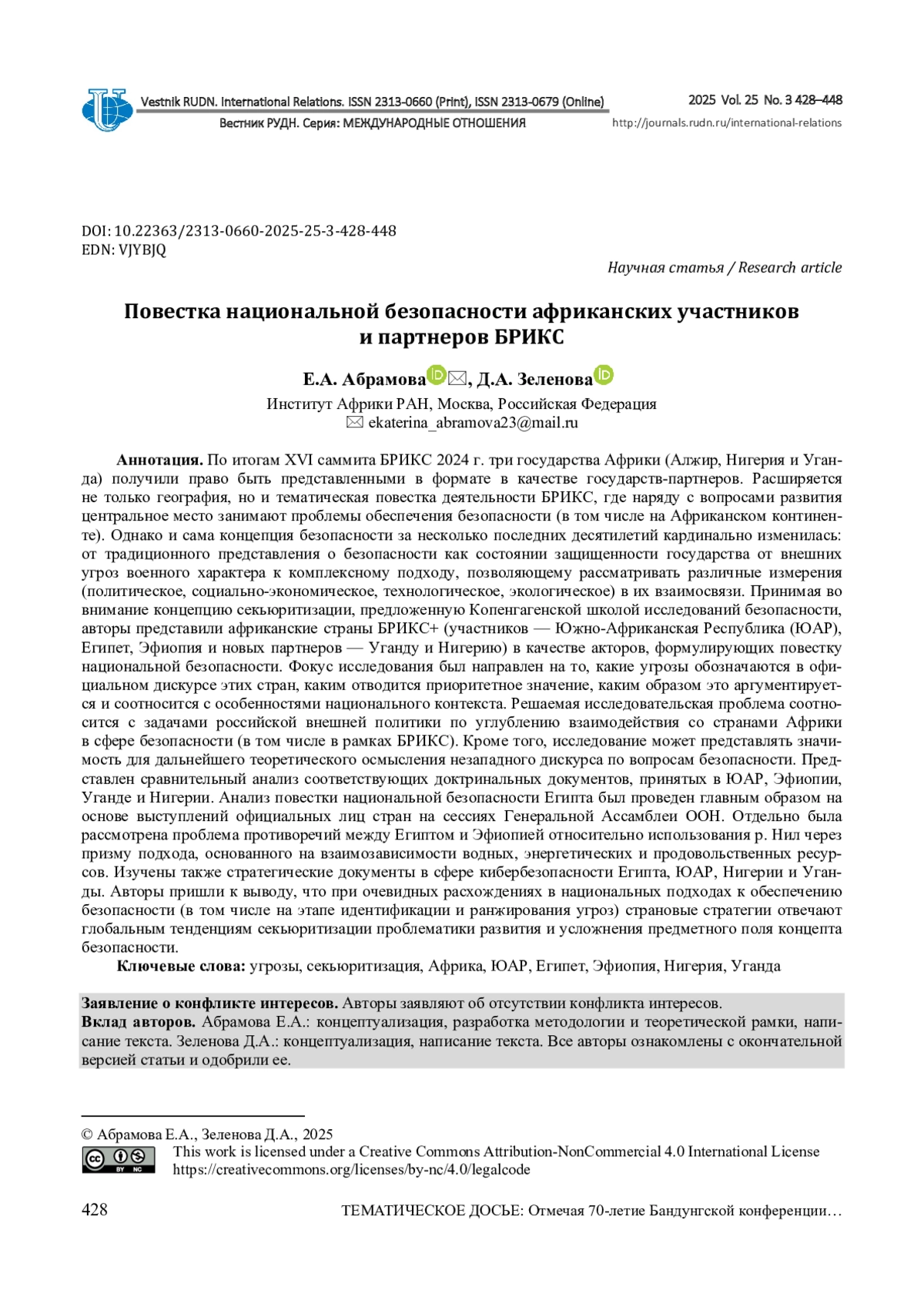 По итогам XVI саммита БРИКС 2024 г. три государства Африки (Алжир, Нигерия и Уганда) получили право быть представленными в формате в качестве государств-партнеров. Расширяется не только география, но и тематическая повестка деятельности БРИКС, где наряду с вопросами развития центральное место занимают проблемы обеспечения безопасности (в том числе на Африканском континенте). Однако и сама концепция безопасности за несколько последних десятилетий кардинально изменилась: от традиционного представления о безопасности как состоянии защищенности государства от внешних угроз военного характера к комплексному подходу, позволяющему рассматривать различные измерения (политическое, социально-экономическое, технологическое, экологическое) в их взаимосвязи. Принимая во внимание концепцию секьюритизации, предложенную Копенгагенской школой исследований безопасности, авторы представили африканские страны БРИКС+ (участников - Южно-Африканская Республика (ЮАР), Египет, Эфиопия и новых партнеров - Уганду и Нигерию) в качестве акторов, формулирующих повестку национальной безопасности. Фокус исследования был направлен на то, какие угрозы обозначаются в официальном дискурсе этих стран, каким отводится приоритетное значение, каким образом это аргументируется и соотносится с особенностями национального контекста. Решаемая исследовательская проблема соотносится с задачами российской внешней политики по углублению взаимодействия со странами Африки в сфере безопасности (в том числе в рамках БРИКС). Кроме того, исследование может представлять значимость для дальнейшего теоретического осмысления незападного дискурса по вопросам безопасности. Представлен сравнительный анализ соответствующих доктринальных документов, принятых в ЮАР, Эфиопии, Уганде и Нигерии. Анализ повестки национальной безопасности Египта был проведен главным образом на основе выступлений официальных лиц стран на сессиях Генеральной Ассамблеи ООН. Отдельно была рассмотрена проблема противоречий между Египтом и Эфиопией относительно использования р. Нил через призму подхода, основанного на взаимозависимости водных, энергетических и продовольственных ресурсов. Изучены также стратегические документы в сфере кибербезопасности Египта, ЮАР, Нигерии и Уганды. Авторы пришли к выводу, что при очевидных расхождениях в национальных подходах к обеспечению безопасности (в том числе на этапе идентификации и ранжирования угроз) страновые стратегии отвечают глобальным тенденциям секьюритизации проблематики развития и усложнения предметного поля концепта безопасности.