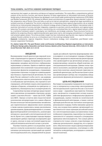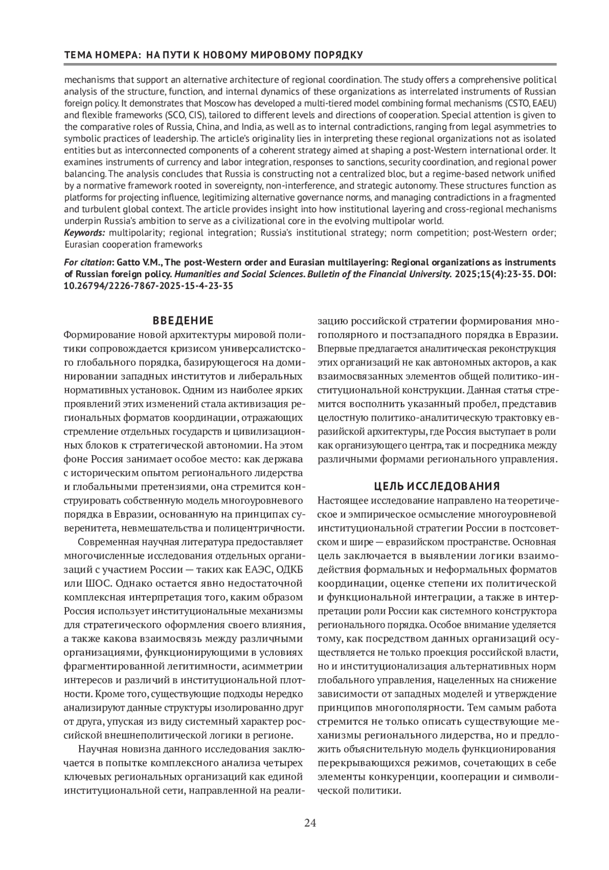 Статья посвящена исследованию институциональной стратегии России на евразийском пространстве через призму четырех ключевых региональных организаций: Евразийского экономического союза, Шанхайской организации сотрудничества, Организации Договора о коллективной безопасности и Содружества Независимых Государств. На фоне трансформации международного порядка, ослабления западных моделей глобального управления и перехода к многополярности Россия стремится закрепить свои интересы через институциональные механизмы, позволяющие формировать альтернативную архитектуру региональной координации. В работе предлагается комплексный политико-аналитический анализ логики, структуры и динамики указанных объединений как взаимосвязанных элементов внешнеполитической стратегии России. Показано, что Москва реализует многослойную модель, включающую формализованные механизмы (ОДКБ, ЕАЭС) и гибкие форматы (ШОС, СНГ), адаптированные под разные направления и уровни интеграции. Отдельное внимание уделено сравнительному анализу роли России, Китая и Индии, а также внутренним противоречиям в институциональной практике — от разницы в правовых режимах до символической политики регионального лидерства. Новизна исследования заключается в интерпретации региональных организаций не как изолированных институтов, а как функционально связанных компонентов целостной стратегии построения постзападного порядка. В статье рассматриваются механизмы валютной и трудовой интеграции, последствия санкционного давления, логика безопасности и принципы политического балансирования. Сделан вывод о том, что Россия конструирует не централизованный блок, а сеть режимов, объединенных общей нормативной платформой, в рамках которой утверждаются принципы суверенитета, невмешательства и стратегической автономии. Эти структуры выступают аренами проекции влияния, легитимации альтернативных норм и управления противоречиями в условиях глобальной турбулентности.