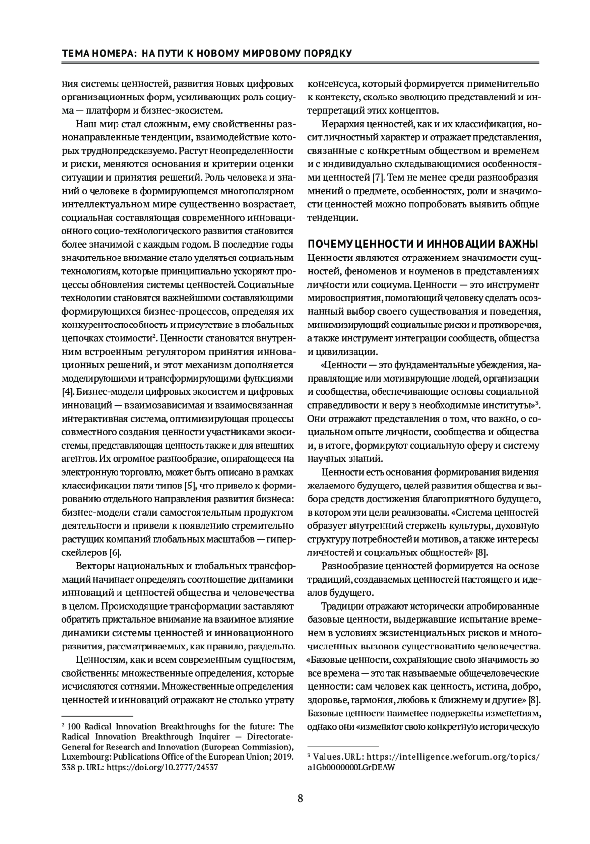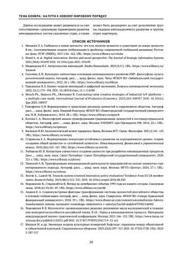 Инновационное развитие в эпоху цифровой трансформации стало стремительно менять все сферы человеческой деятельности. Глубокие и принципиальные изменения стали менять не только реальный и виртуальный миры, но и основания системы фундаментальных убеждений, лежащих в основе формирования личности и социума — системы ценностей. Инновации стали важнейшим фактором, определяющим динамику изменений человека и общества и результаты экономического и научно-технологического развития. Исследования инноваций в лучшем случае отчасти учитывают систему ценностей как некие статичные особенности национальных инновационных систем. Часто влияние системы ценностей игнорируется и подменяется учетом исключительно технологических факторов развития. Значительное число исследований ценностей не рассматривает влияние инноваций на их динамику. Но и ценности, и инновации оказываются ключевыми факторами влияния на происходящие глубокие изменения, при этом оказывая значимое взаимное влияние друг на друга. Целью статьи является осмысление проблемы взаимного влияния инноваций и ценностей, их совместной эволюции и результирующего влияния на социотехнологическое развитие в условиях цифровой транс формации. В исследовании использованы материалы отечественных диссертационных исследований, современных научных статей зарубежных и отечественных авторов, результаты международного исследования World Values Survey (WVS) и шестимерного представления ценностей по методике Г. Хофстеде. Поскольку исследования взаимного влияния ценностей и инноваций практически отсутствуют, авторы выделили небольшую группу стран–лидеров инновационного развития — США, Республику Корея и КНР, данные о системах ценностей которых сопоставляются с данными России. Из общего массива вопросов анкеты седьмой волны исследований WVS выбраны 10 параметров ценностных систем, непосредственно характеризующих инновационное развитие стран. Представлены выводы сравнительного сопоставления систем ценностей указанных стран по параметрам WVS, которые сопоставлены с результатами шестимерного анализа этих стран по методике Г. Хофстеде (G. Hofstede). Сделано заключение о практической применимости результатов для согласования инновационной политики России и КНР, аналогично результатам выполненного ранее диссертационного исследования Д. Н. Соломина. Рассмотрено перспективное развитие исследования за счет сопоставления динамики ценностей с последними данными развития инновационных систем указанных стран.