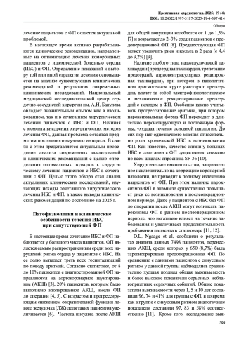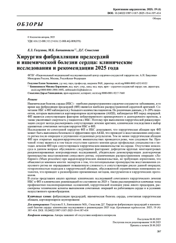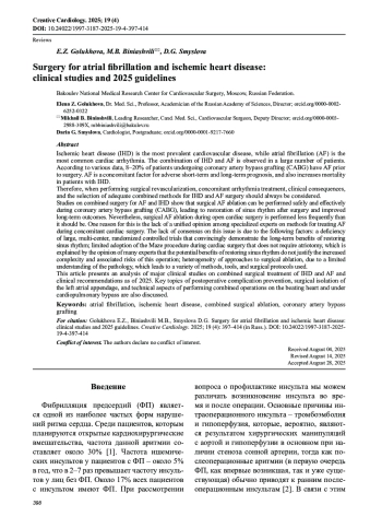 В статье представлен анализ крупных клинических исследований сочетанного хирургического лечения ИБС и ФП и клинических рекомендаций по состоянию на 2025 г. Также рассматриваются ключевые темы профилактики послеоперационных осложнений, хирургической изоляции ушка левого предсердия, рассмотрены технические аспекты выполнения сочетанных операций на работающем сердце и в условиях искусственного кровообращения.