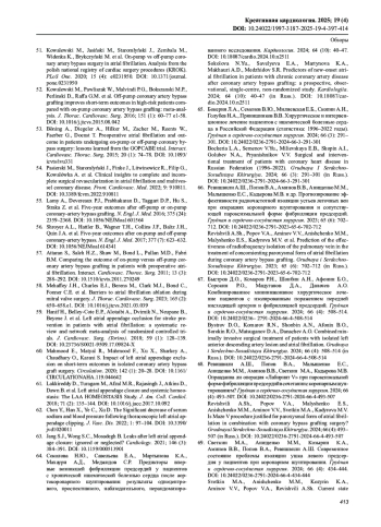 15. Dąbrowski E.J., Kurasz A., Pasierski M., Pannone L., Kołodziejczak M.M., Raffa G.M. et al. Surgical coronary revascularization in patients with underlying atrial fibrillation: state-of-the-art review. Mayo Clin. Proc. 2024; 99 (6): 955-970. DOI: 10.1016/j.mayocp.2023.12.005