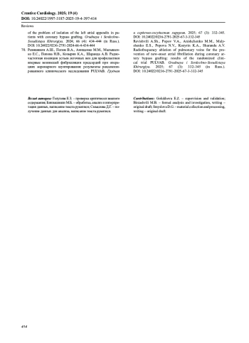 70. Ревишвили А.Ш., Попов В.А., Анищенко М.М., Малышенко Е.С., Попова Н.В., Козырин К.А., Шаранда А.В. Радиочастотная изоляция устьев легочных вен для профилактики впервые возникшей фибрилляции предсердий при операциях коронарного шунтирования: результаты рандомизированного клинического исследования PULVAB. Грудная и сердечно-сосудистая хирургия. 2025; 67 (3): 332-345.