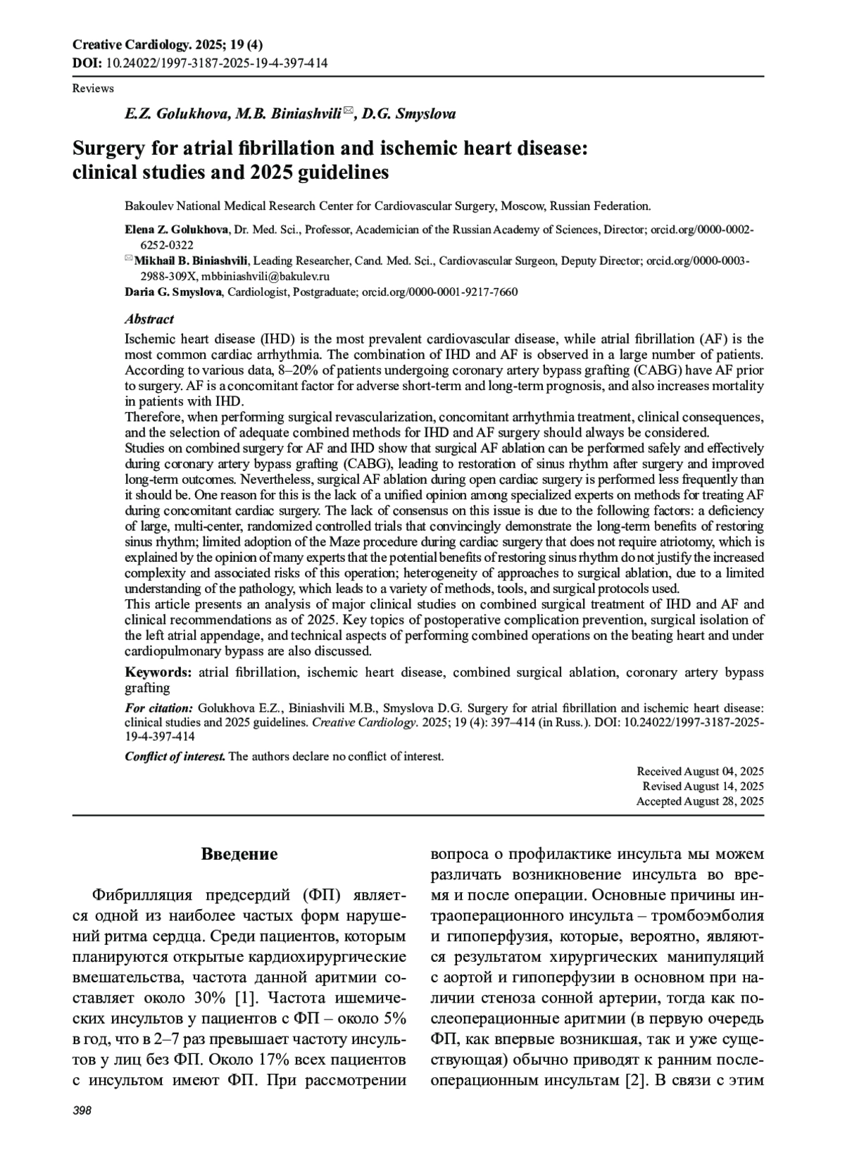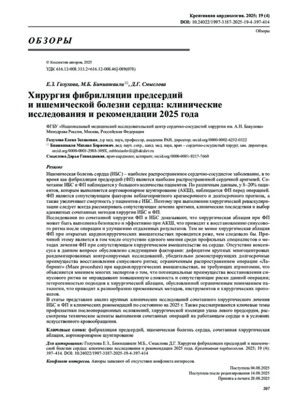 38. Биниашвили М.Б., Донаканян С.А., Ле Т.Г., Испирян А.Ю., Юркулиева Г.А., Бокерия Л.А. Хирургическая аблация фибрилляции предсердий при аортокоронарном шунтировании на работающем сердце. Сердечно-сосудистые заболевания. Бюллетень НЦССХ им. А.Н. Бакулева РАМН. 2024; 25 (6) 66: 1-242. DOI: 10.24022/1810-0694-2024-25S