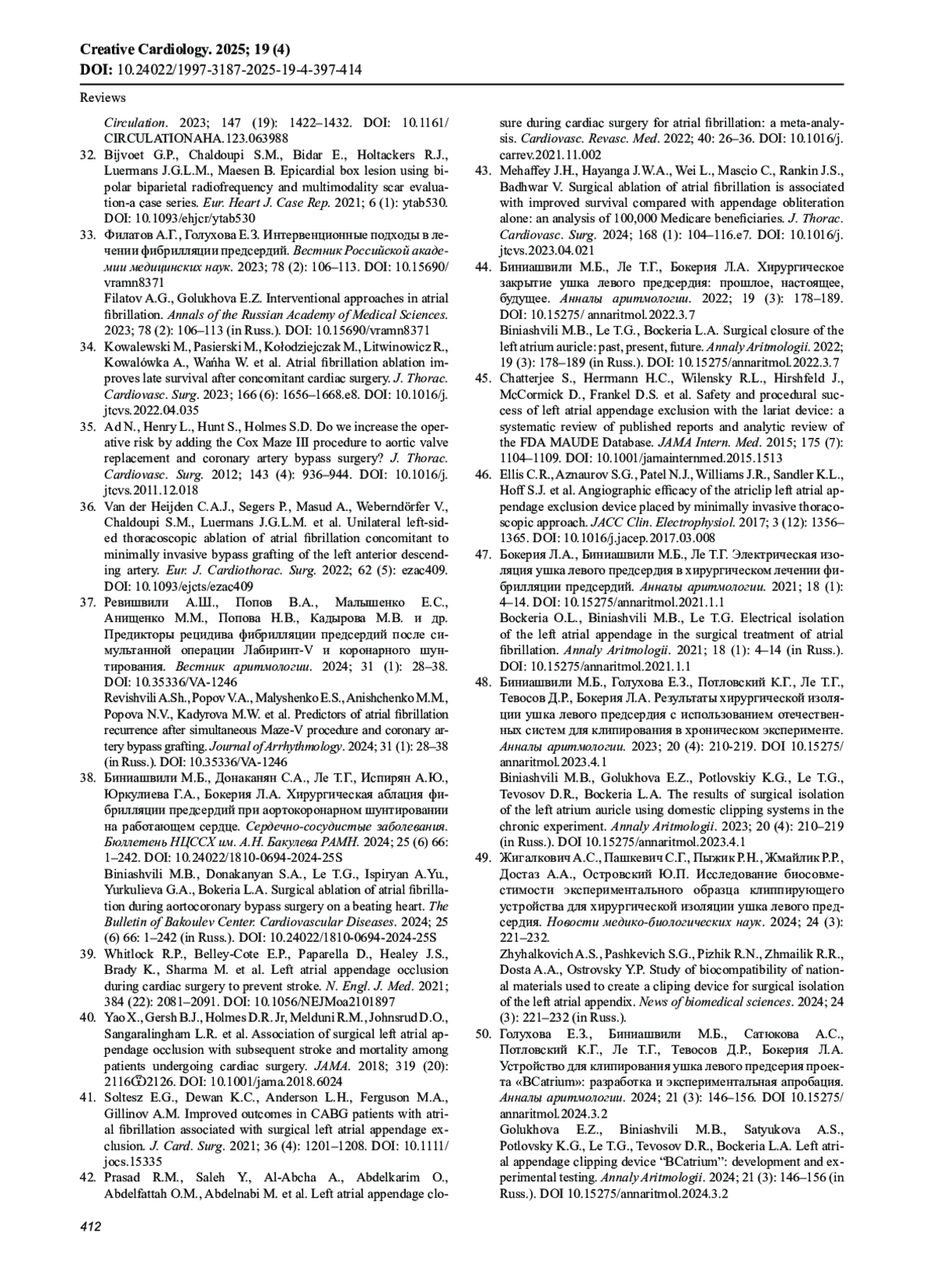 42. Prasad R.M., Saleh Y., Al-Abcha A., Abdelkarim O., Abdelfattah O.M., Abdelnabi M. et al. Left atrial appendage closure during cardiac surgery for atrial fibrillation: a meta-analysis. Cardiovasc. Revasc. Med. 2022; 40: 26-36. DOI: 10.1016/j.carrev.2021.11.002