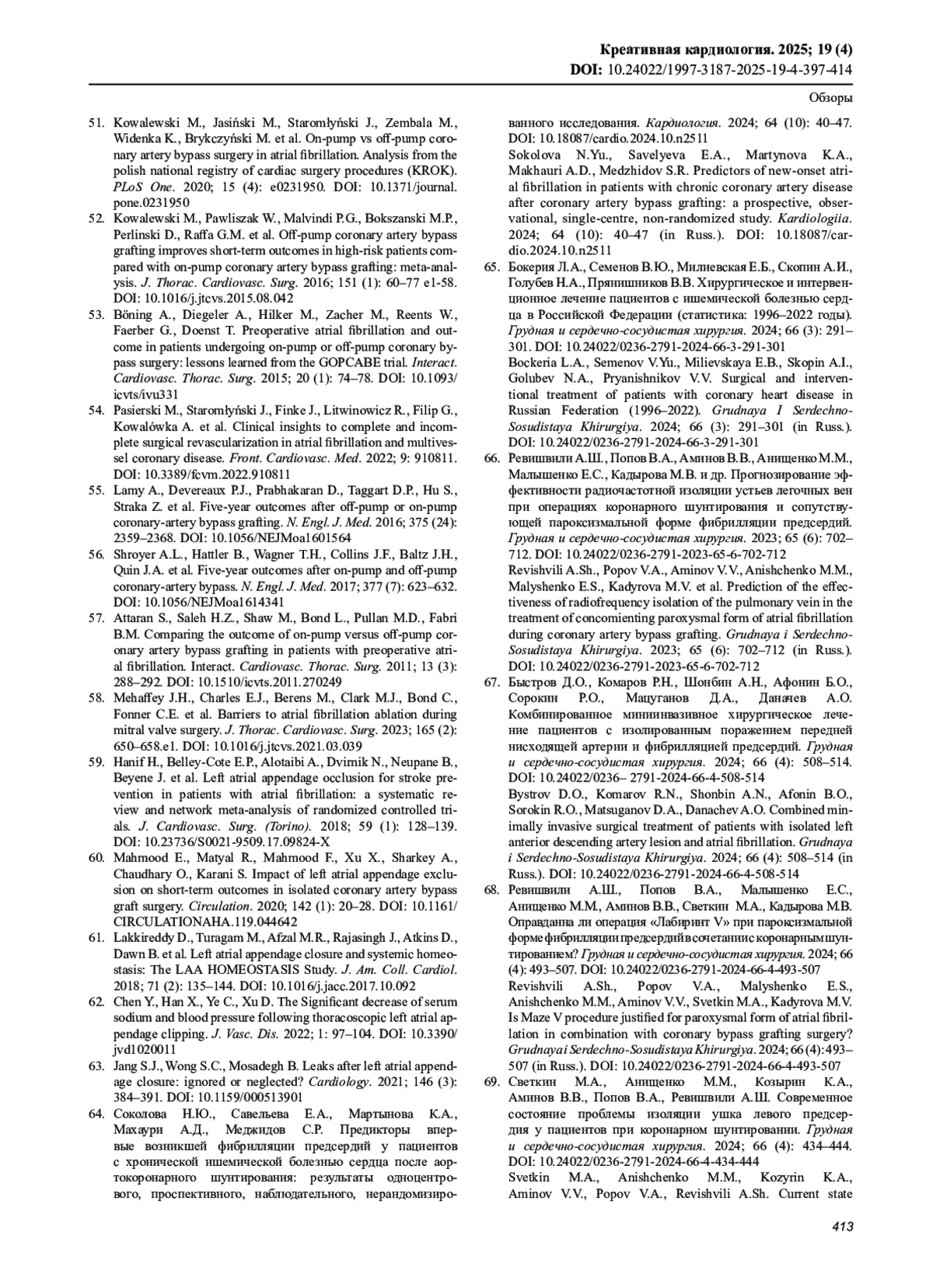 64. Соколова Н.Ю., Савельева Е.А., Мартынова К.А., Махаури А.Д., Меджидов С.Р. Предикторы впервые возникшей фибрилляции предсердий у пациентов с хронической ишемической болезнью сердца после аортокоронарного шунтирования: результаты одноцентрового, проспективного, наблюдательного, нерандомизированного исследования. Кардиология. 2024; 64 (10): 40-47. DOI: 10.18087/cardio.2024.10.n2511