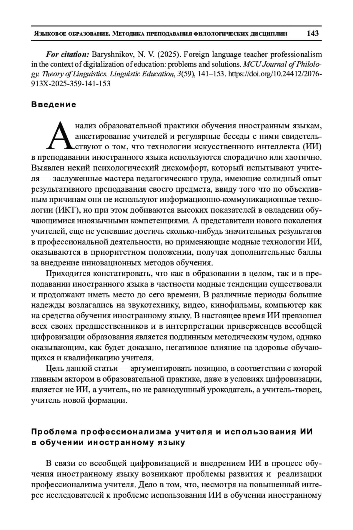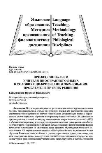 В статье рассматривается ряд взаимосвязанных трудноразрешимых проблем профессионализма учителя иностранного языка и его реализации в условиях стремительной и недостаточно научно обоснованной цифровизации системы образования в целом и процесса обучения иностранному языку в частности. В ходе анализа противоречивых позиций по вопросу использования искусственного интеллекта (ИИ) в обучении иностранному языку аргументирована авторская точка зрения о необходимости научного обоснования методической целесообразности использования цифровых технологий и разработки не наносящего вреда здоровью обучающихся регламента использования ИИ в преподавании предмета «Иностранный язык» на различных этапах обучения. Выявлены такие проблемы и трудности реализации профессионализма учителя иностранного языка, как отсутствие условий для методического творчества, снижение уровня профессионализма учителя ввиду нерегулируемого, а часто хаотического использования ИИ в процессе языковой подготовки обучающихся, унификации практик обучения иностранным языкам, формализации повышения квалификации учителя. Предложены наиболее приемлемые, по мнению автора, пути решения изложенных проблем и устранения выявленных трудностей реализации профессионализма учителя иностранного языка.