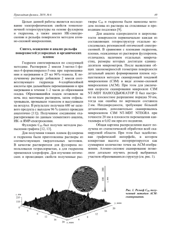 Анализ рельефа поверхности показал разветвленную геометрию органо-углеродных структур. Углеродные составляющие формируются в виде микрочастиц, расположенных на достаточно тонких пленках, которые можно охарактеризовать как относительно однородные с отдельными островковыми образованиями. Исследование ИК-спектров органического соединения показало наличие множества пиков поглощения гидразона.