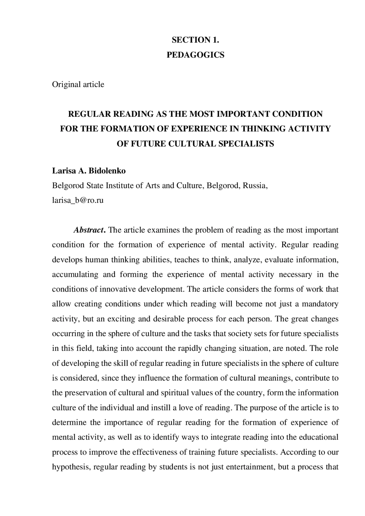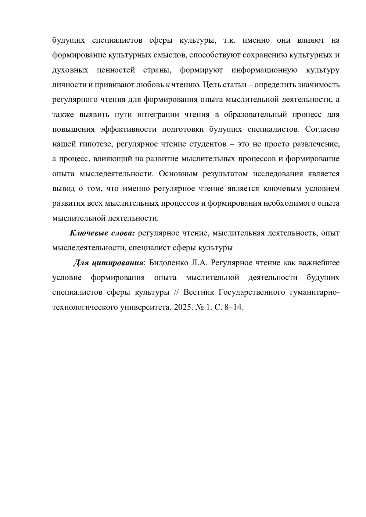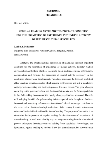 В статье исследуется проблема чтения как важнейшего условия формирования опыта мыследеятельности. Регулярное чтение развивает мыслительные способности человека, учит думать, анализировать, оценивать информацию, накапливая и формируя необходимый в условиях инновационного развития опыт мыслительной деятельности. В статье рассматриваются формы работы, позволяющие сформировать условия, при которых чтение станет не просто обязательным занятием, а увлекательным и желанным процессом для каждого человека. Отмечаются большие перемены, происходящие в сфере культуры и задачи, которые ставит общество перед будущими специалистами данной сферы с учётом быстроменяющейся ситуации. Рассматривается роль формирования навыка регулярного чтения у будущих специалистов сферы культуры, т. к. именно они влияют на формирование культурных смыслов, способствуют сохранению культурных и духовных ценностей страны, формируют информационную культуру личности и прививают любовь к чтению. Цель статьи - определить значимость регулярного чтения для формирования опыта мыслительной деятельности, а также выявить пути интеграции чтения в образовательный процесс для повышения эффективности подготовки будущих специалистов. Согласно нашей гипотезе, регулярное чтение студентов - это не просто развлечение, а процесс, влияющий на развитие мыслительных процессов и формирование опыта мыследеятельности. Основным результатом исследования является вывод о том, что именно регулярное чтение является ключевым условием развития всех мыслительных процессов и формирования необходимого опыта мыслительной деятельности.