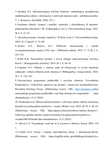 3. Гендина Н.И. Информационная культура личности: технология продуктивной интеллектуальной работы с информацией в условиях интернет-среды: учебное пособие. Т. 1. Кемерово: КемГИК, 2020. 357 с.