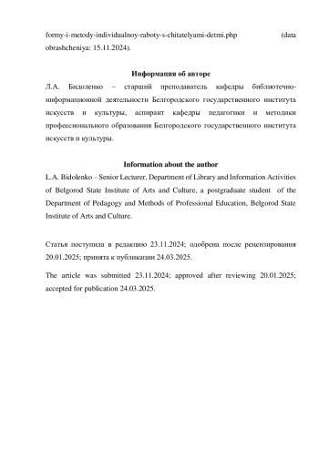 12. Уникель Д.А. Формы и методы индивидуальной работы с читателями-детьми. [Электронный ресурс]. URL: https://tagillib.ru/for_profi/biblioprofi/unikel-d-a-formy-i-metody-individualnoy-raboty-s-chitatelyami-detmi.php (дата обращения: 15.11.2024).