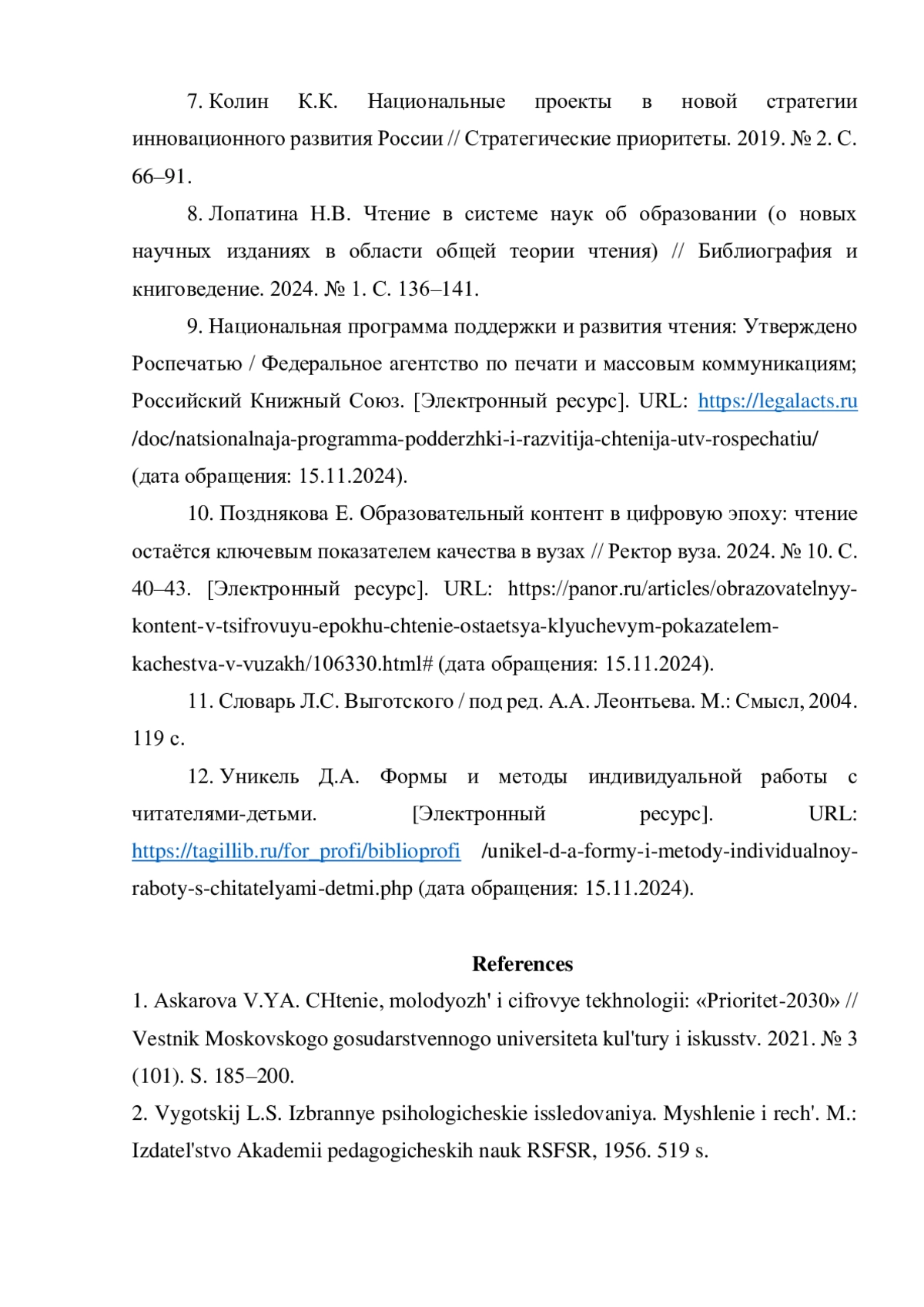 1. Аскарова В.Я. Чтение, молодёжь и цифровые технологии: “Приоритет-2030” // Вестник Московского государственного университета культуры и искусств. 2021. № 3 (101). С. 185-200. EDN: SGYDOG