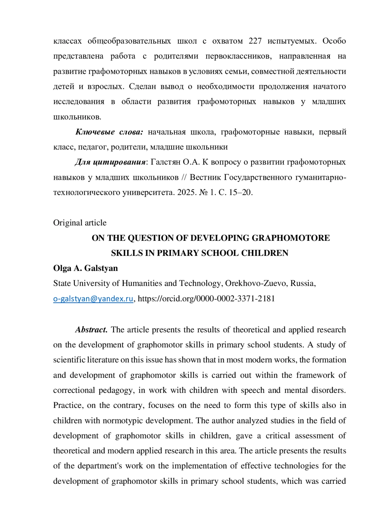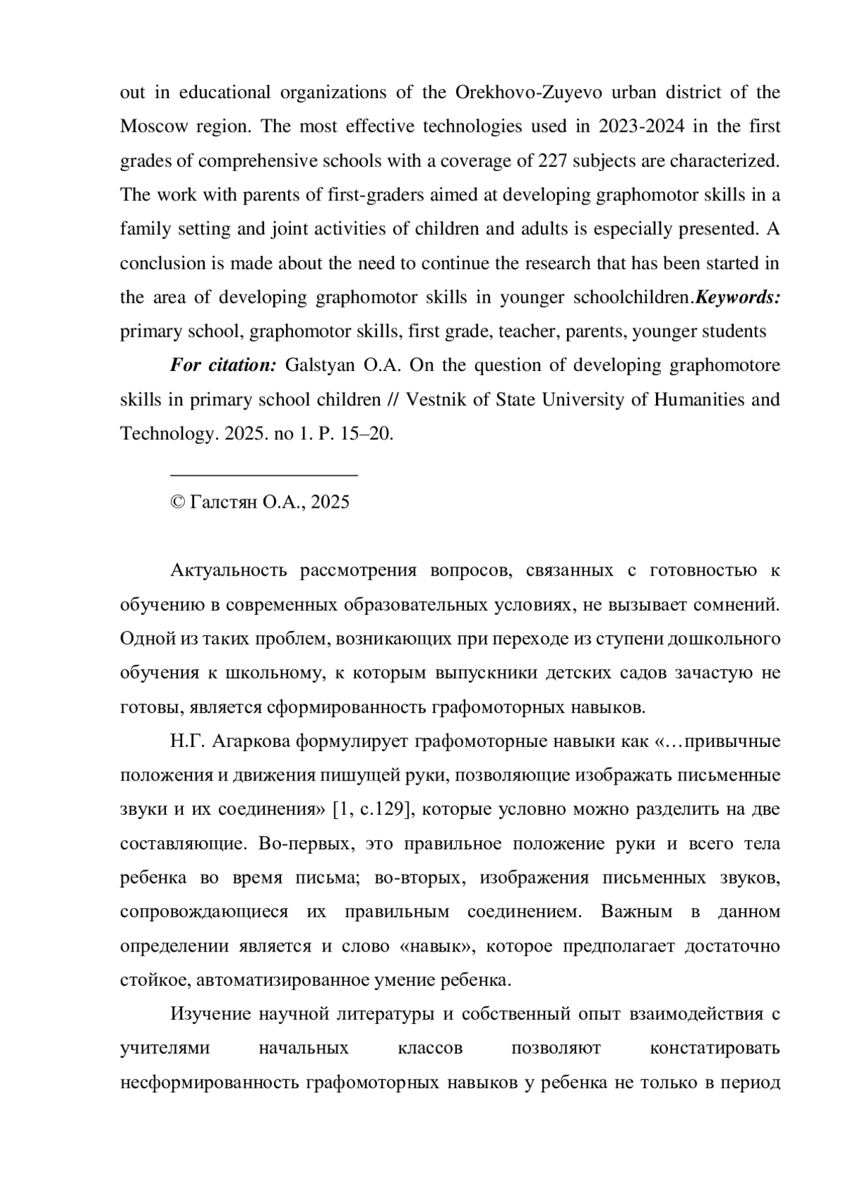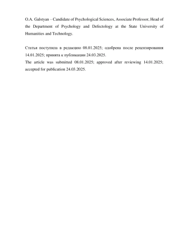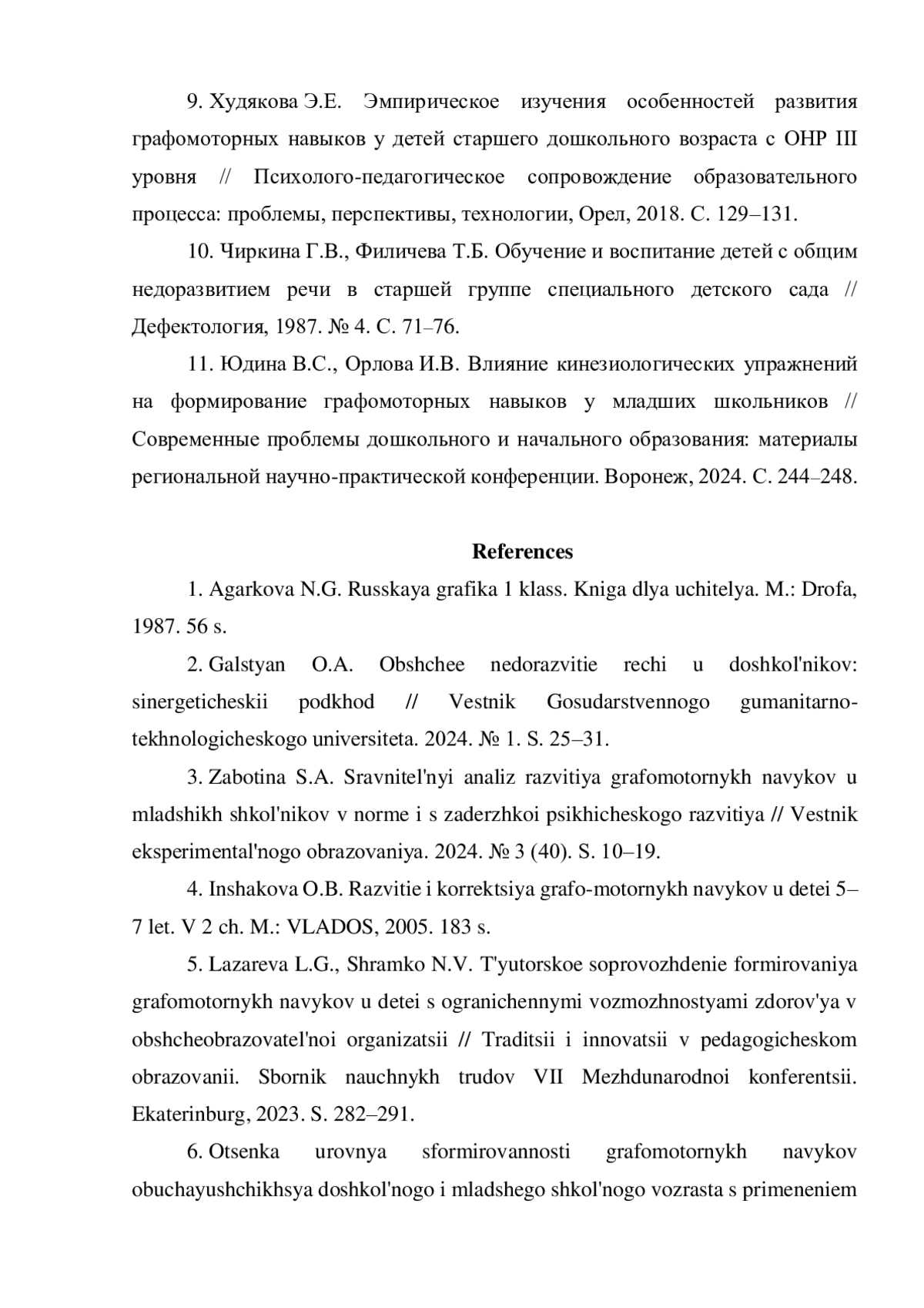 2. Галстян О.А. Общее недоразвитие речи у дошкольников: синергетический подход // Вестник Государственного гуманитарно-технологического университета. 2024. № 1. С. 25-31. EDN: GODCOO