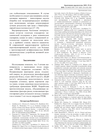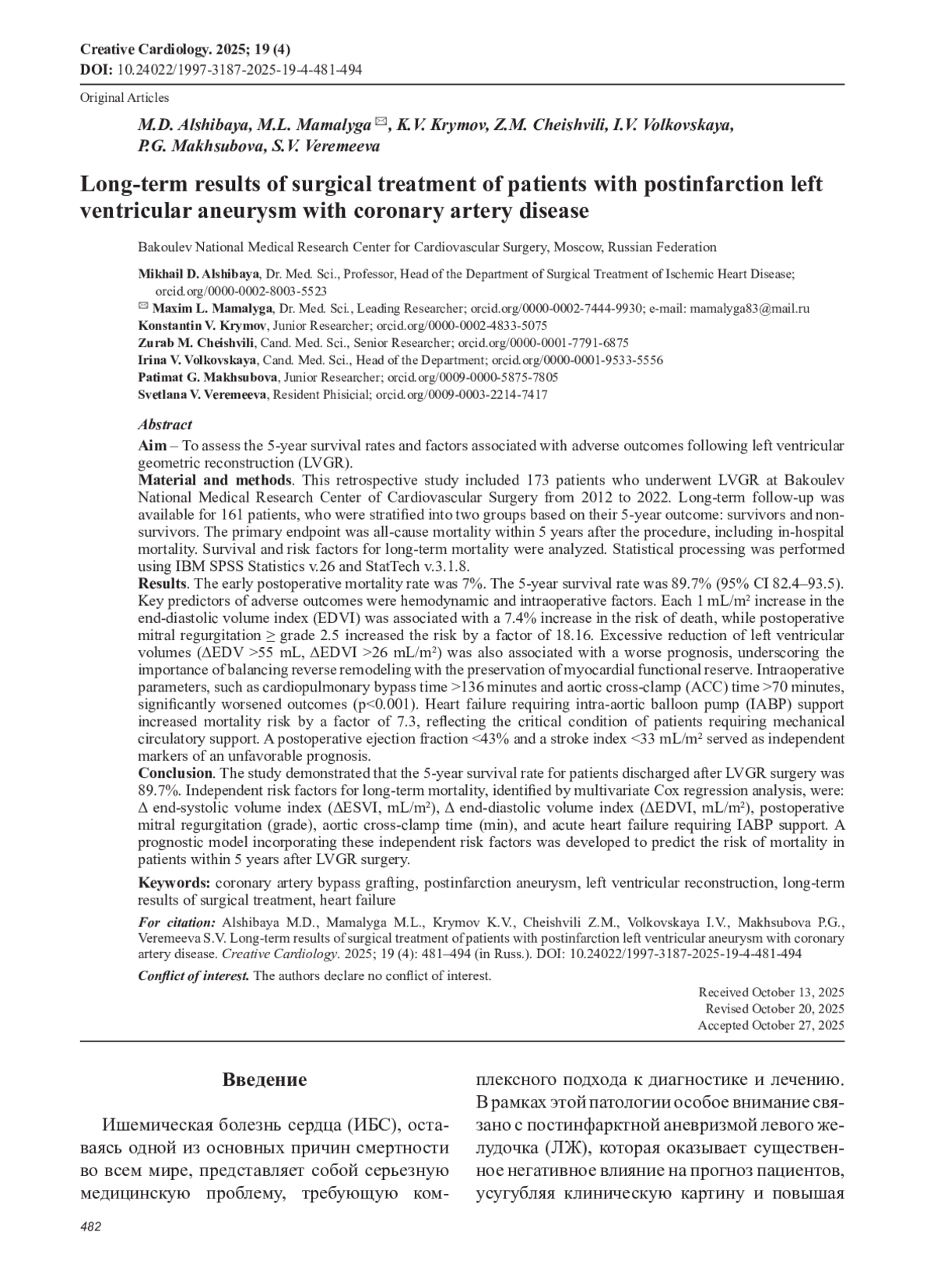 АЛШИБАЯ М. Д., МАМАЛЫГА М. Л., КРЫМОВ К. В., ЧЕИШВИЛИ З. М., ВОЛКОВСКАЯ И. В., МАХСУБОВА П. Г., ВЕРЕМЕЕВА С. В. ОТДАЛЕННЫЕ РЕЗУЛЬТАТЫ ХИРУРГИЧЕСКОГО ЛЕЧЕНИЯ БОЛЬНЫХ ИШЕМИЧЕСКОЙ БОЛЕЗНЬЮ СЕРДЦА С ПОСТИНФАРКТНОЙ АНЕВРИЗМОЙ ЛЕВОГО ЖЕЛУДОЧКА // КРЕАТИВНАЯ КАРДИОЛОГИЯ. 2025. № 4, ТОМ 19