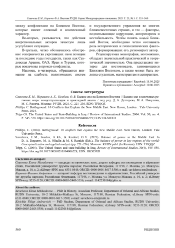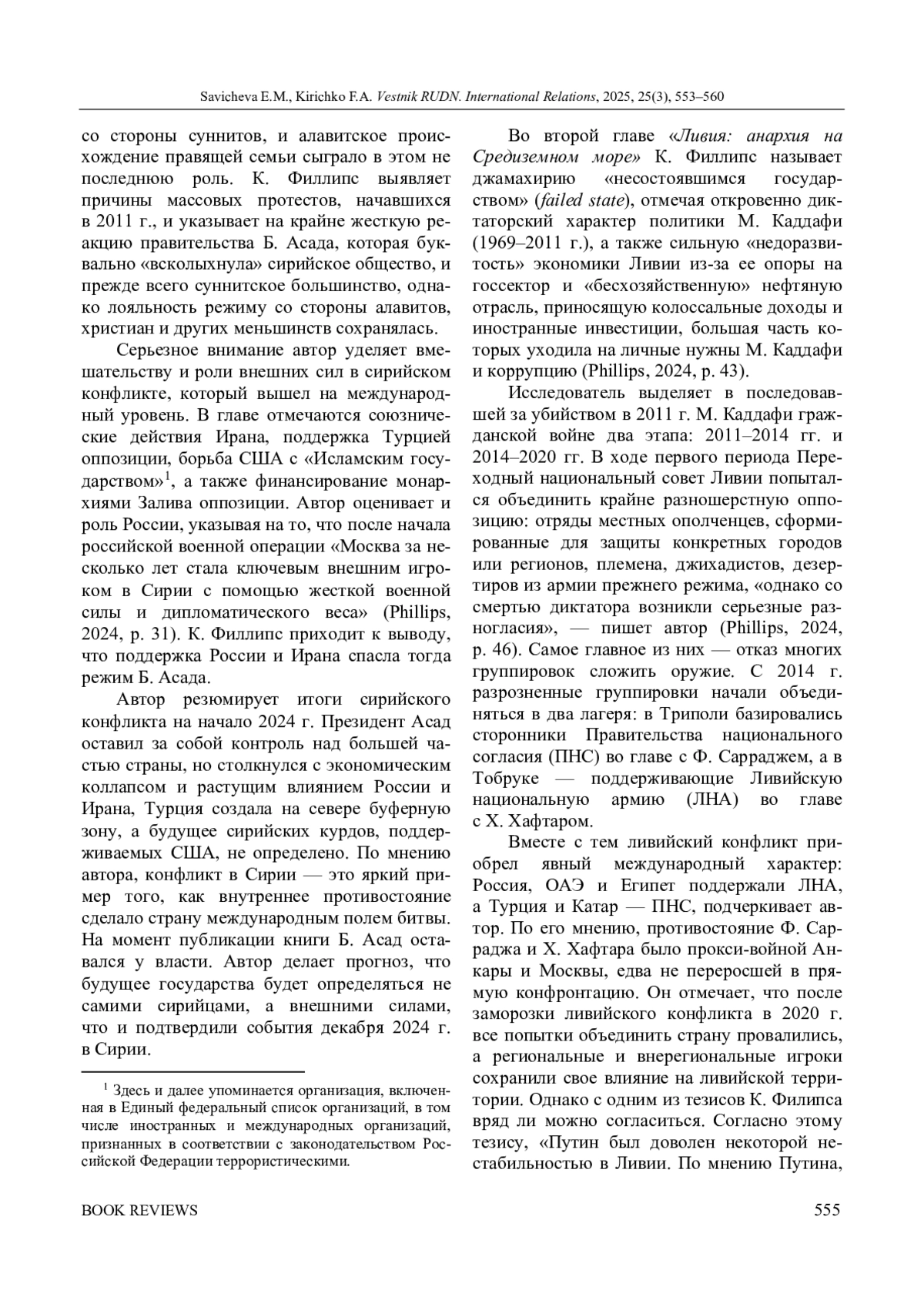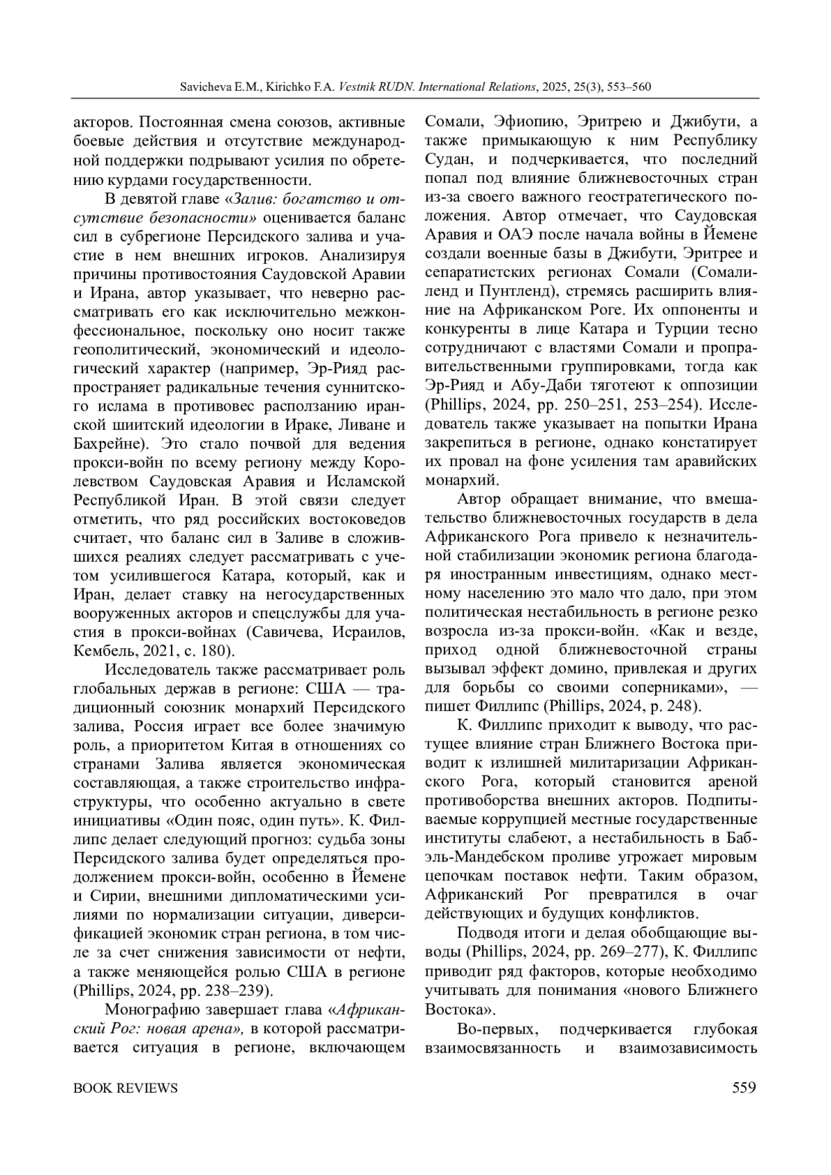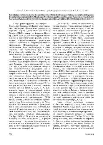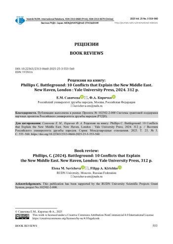 Для цитирования: Савичева Е. М., Киричко Ф. А. Рецензия на книгу: Phillips C. Battleground: 10 Conflicts that Explain the New Middle East. New Haven, London: Yale University Press, 2024. 312 p. // Вестник Российского университета дружбы народов. Серия: Международные отношения. 2025. Т. 25, № 3. С. 553–560. https://doi. org/10.22363/2313-0660-2025-25-3-553-560