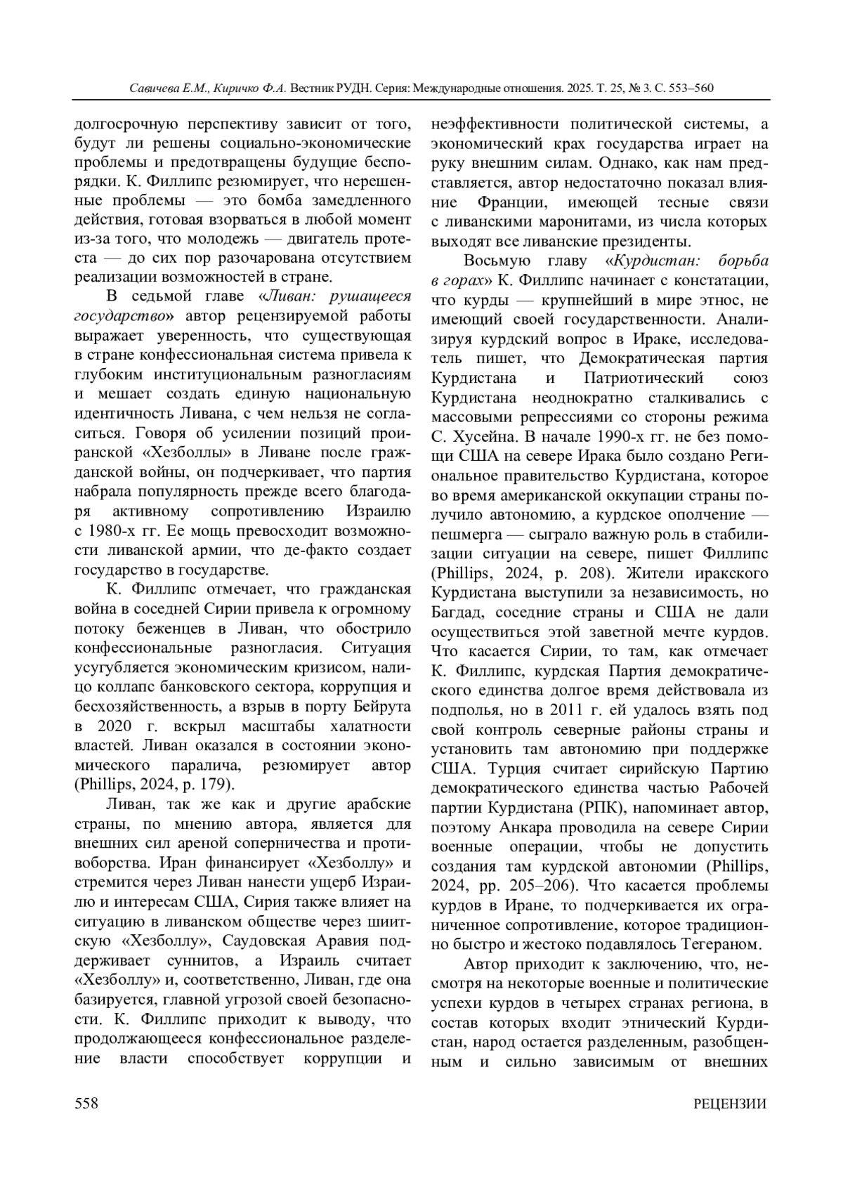 САВИЧЕВА Е. М., КИРИЧКО Ф. А. РЕЦЕНЗИЯ НА КНИГУ: PHILLIPS C. BATTLEGROUND: 10 CONFLICTS THAT EXPLAIN THE NEW MIDDLE EAST. NEW HAVEN, LONDON: YALE UNIVERSITY PRESS, 2024. 312 P. // ВЕСТНИК РОССИЙСКОГО УНИВЕРСИТЕТА ДРУЖБЫ НАРОДОВ. СЕРИЯ: МЕЖДУНАРОДНЫЕ ОТНОШЕНИЯ. 2025. ТОМ 25 № 3