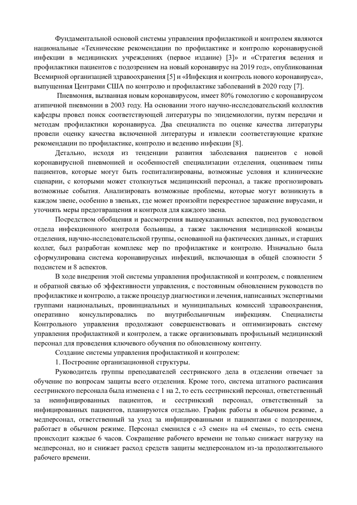 Фундаментальной основой системы управления профилактикой и контролем являются национальные «Технические рекомендации по профилактике и контролю коронавирусной инфекции в медицинских учреждениях (первое издание) [3]» и «Стратегия ведения и профилактики пациентов с подозрением на новый коронавирус на 2019 год», опубликованная Всемирной организацией здравоохранения [5] и «Инфекция и контроль нового коронавируса», выпущенная Центрами США по контролю и профилактике заболеваний в 2020 году [7]. Пневмония, вызванная новым коронавирусом, имеет 80% гомологию с коронавирусом атипичной пневмонии в 2003 году. На основании этого научно-исследовательский коллектив кафедры провел поиск соответствующей литературы по эпидемиологии, путям передачи и методам профилактики коронавируса. Два специалиста по оценке качества литературы провели оценку качества включенной литературы и извлекли соответствующие краткие рекомендации по профилактике, контролю и ведению инфекции [8].