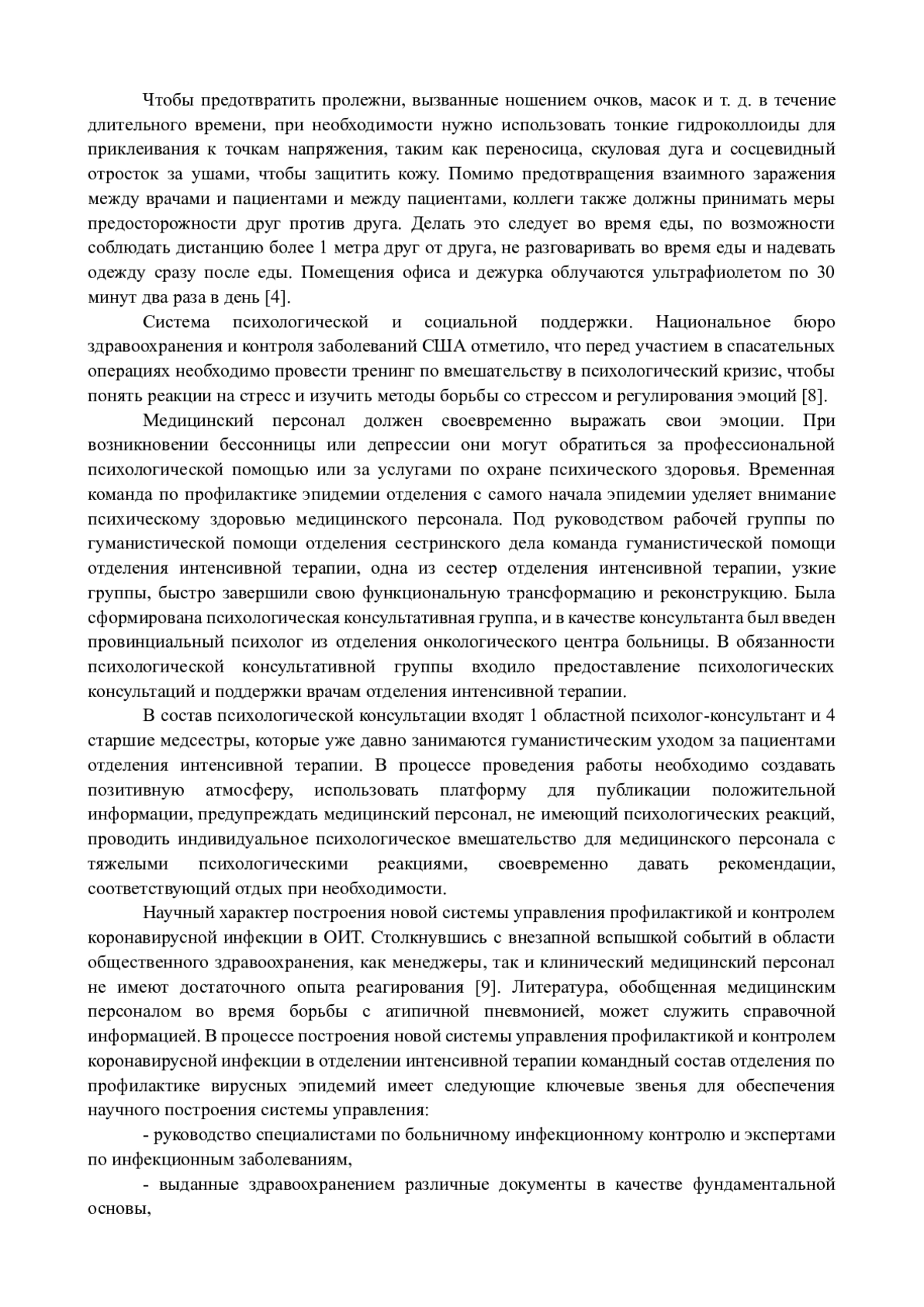 Появление и быстрое распространение новых инфекционных заболеваний оказывают большое влияние на экономическое развитие и социальную стабильность. Инфекционные заболевания являются основной проблемой здравоохранения в настоящее время и на перспективу, а перекрестное инфицирование в стационарах является одним из основных факторов, вызывающих вспышки инфекционных заболеваний [1.3]. Во время эпидемии новой коронавирусной пневмонии (COVID-19) в некоторых медицинских учреждениях заразился медицинский персонал. Подтверждено, что коронавирус (2019-nCoV) обладает сильной способностью передаваться от человека к человеку. Из-за неопределенности возникновения инфекционных заболеваний на ранних стадиях заболевания отсутствуют эффективные меры борьбы, что легко может нанести прямой вред медицинскому персоналу. Поскольку пациенты, поступившие в отделение интенсивной терапии, находятся в критическом состоянии и плохо способны позаботиться о себе, медицинскому персоналу отделения интенсивной терапии приходится проводить больше работы по лечению и уходу.