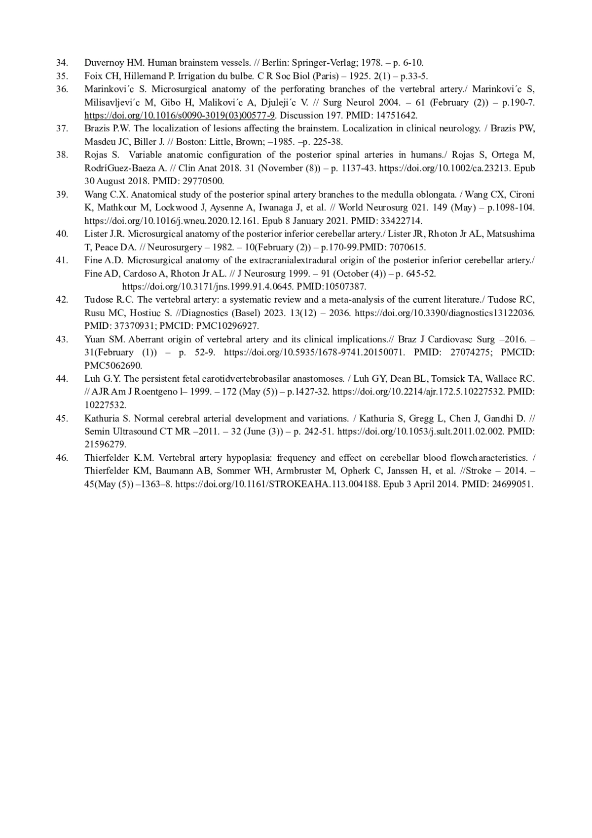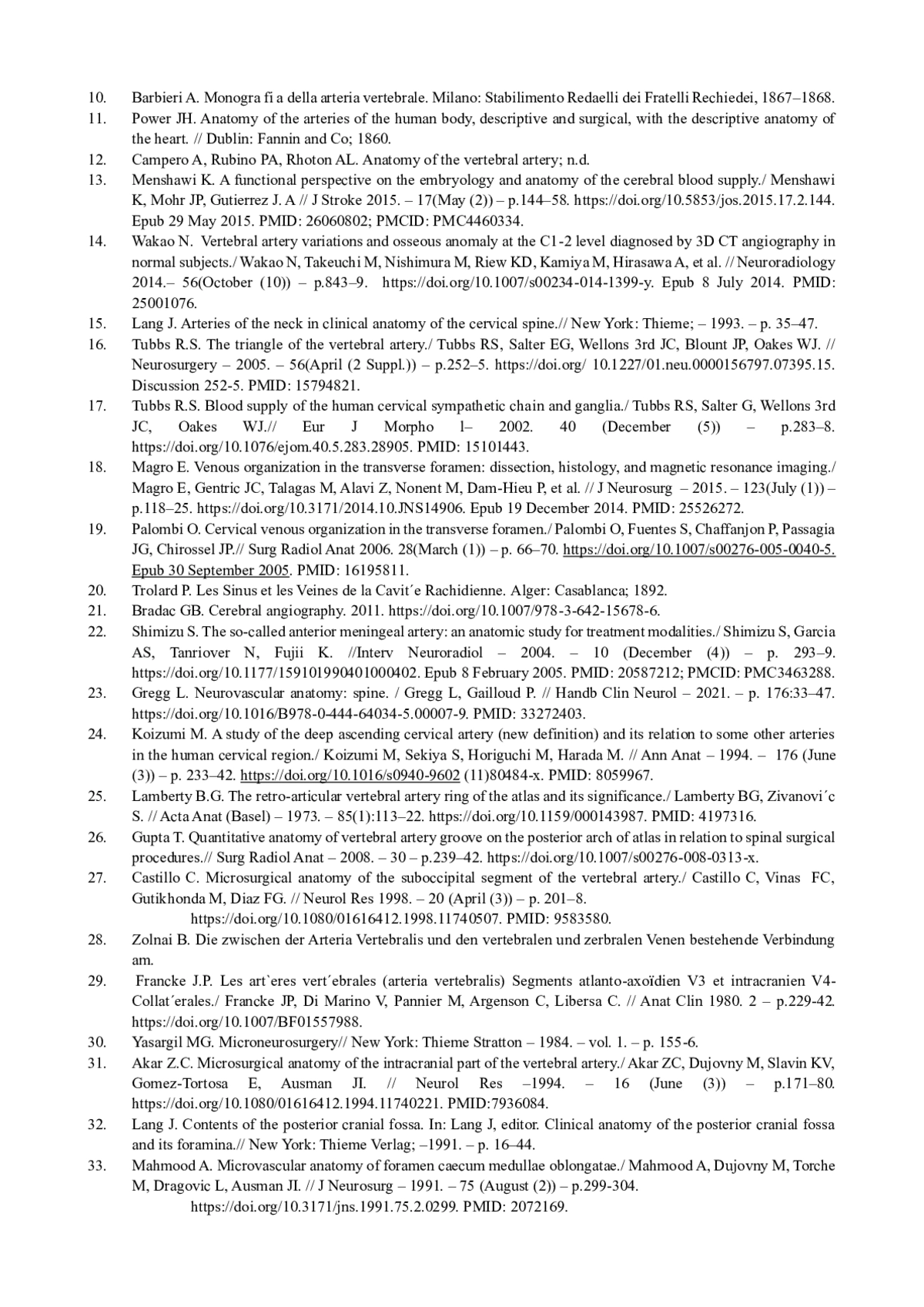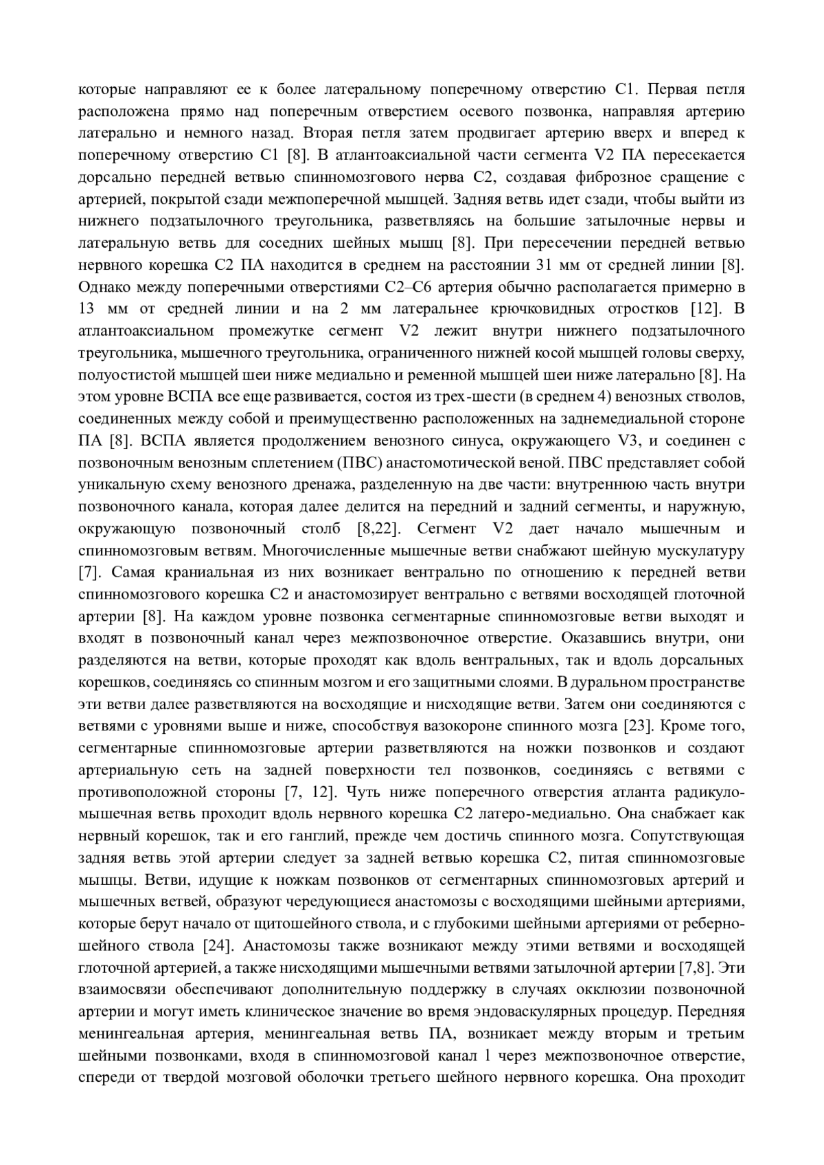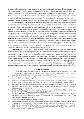 На основе анализа научных трудов (монографий, статей, диссертаций и авторефератов диссертаций) отечественных и зарубежных авторов за период с 1860 до 2023 г обобщены и систематизированы имеющиеся в литературе сведения об анатомии позвоночной артерии у взрослых людей. Представлены данные о топографических взаимоотношениях, распределении ее ветвей и перфораторов, а также взаимосвязях с каротидной системой и их вариантах.