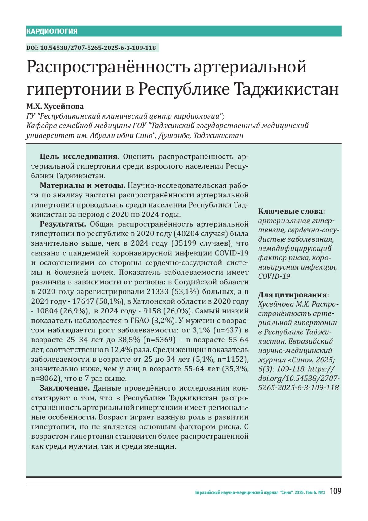 Материалы и методы. Научно-исследовательская работа по анализу частоты распространённости артериальной гипертонии проводилась среди населения Республики Таджикистан за период с 2020 по 2024 годы.