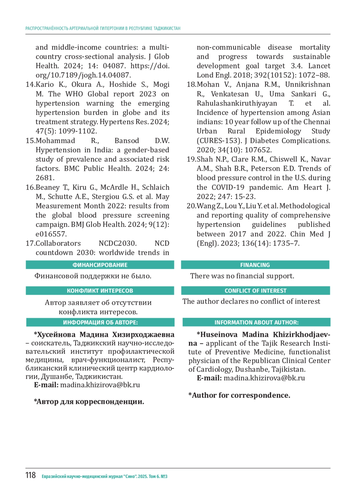 9. Хусейнова М.Х., Ходжиев М.А., Раджабзода М.Э. Артериальная гипертония и её влияние на развитие сердечной недостаточности: от полиорганного поражения к функциональным расстройствам. Евразийский научно-медицинский журнал “Сино”. 2024;5(3):26-39.