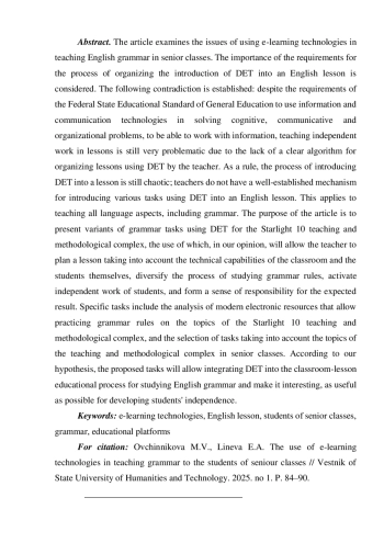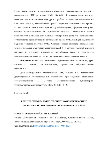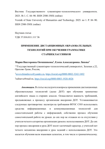 В статье исследуются вопросы применения дистанционных образовательных технологий (далее ДОТ) при обучении грамматике английского языка в старших классах. Осмысляется важность требований, предъявляемых к процессу организации внедрения ДОТ. Устанавливается следующее противоречие: несмотря на требования ФГОС СОО использовать средства информационных и коммуникационных технологий для самостоятельной работы с информацией, собственно процесс обучения самостоятельной работе на уроках до сих пор не отлажен из-за отсутствия у учителя четкого алгоритма организации уроков с использованием ДОТ. До сих пор процесс внедрения в урок ДОТ носит хаотичный характер, у учителей нет четкого механизма внедрения в урок заданий с использованием ДОТ. Это касается обучения всем языковым аспектам, в том числе и грамматическому. Цель статьи состоит в презентации вариантов грамматических заданий с применением ДОТ на основе УМК Starlight 10, использование которых позволит учителю спланировать урок с учётом технических возможностей классной комнаты, разнообразить процесс изучения грамматических правил, активизировать самостоятельную работу обучающихся, сформировать у них чувство ответственности за ожидаемый результат. Конкретные задачи заключаются в анализе современных электронных ресурсов, позволяющих отрабатывать грамматические правила по темам УМК Starlight 10, подборе заданий с учетом тематики УМК. Согласно нашей гипотезе, предлагаемые задания позволят осуществить интеграцию ДОТ в классно-урочный учебный процесс по изучению грамматики английского языка и сделать его максимально полезным для развития самостоятельности обучающихся.