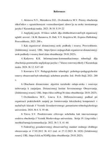 1. Акимова Н.В., Меренкова Д.Е., Овчинникова М.В. Приемы обучения школьников с ограниченными возможностями здоровья на уроке иностранного языка // Казанская наука. 2023. № 10. С.19-22. EDN: IBULIU