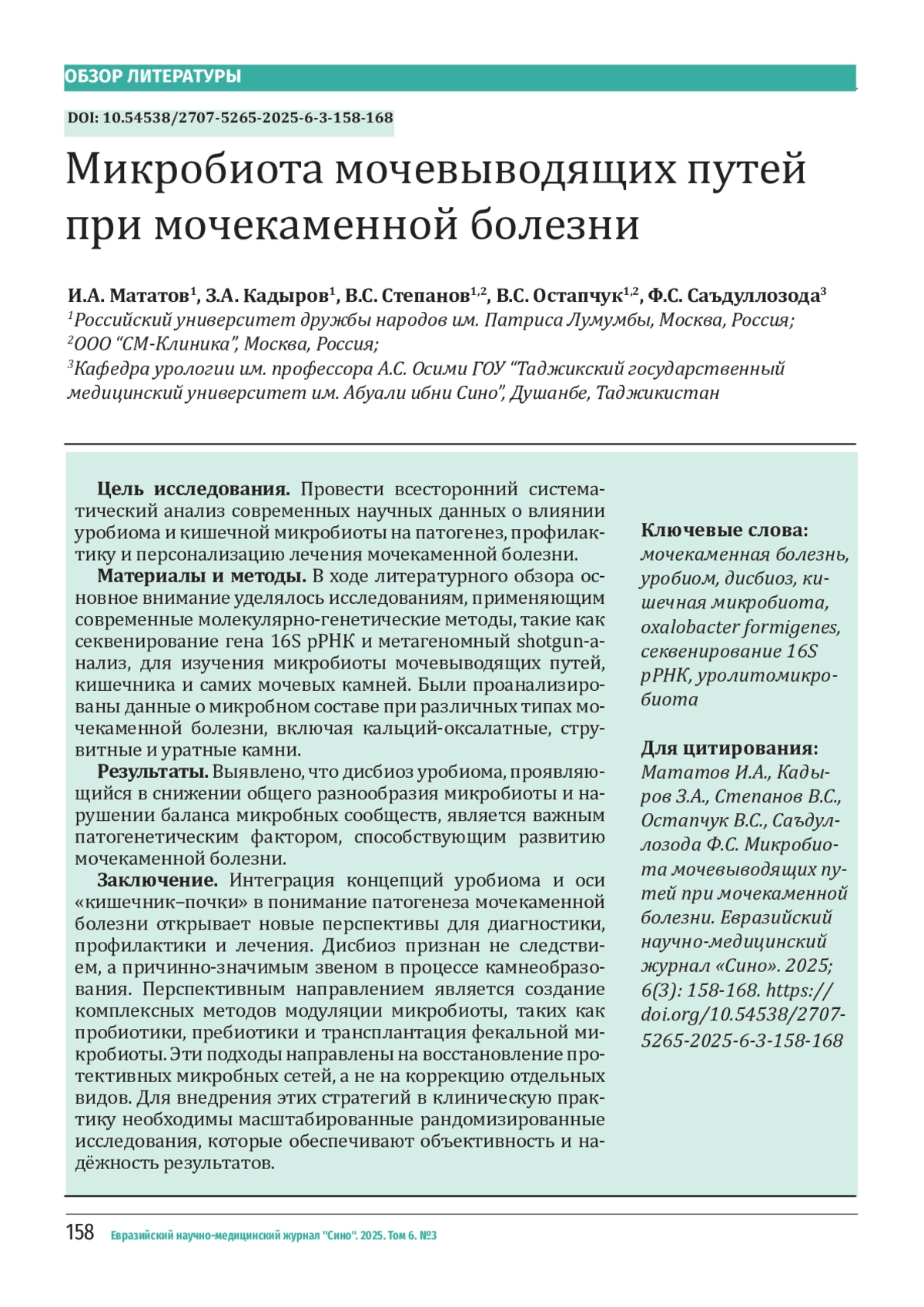 Цель исследования. Провести всесторонний систематический анализ современных научных данных о влиянии уробиома и кишечной микробиоты на патогенез, профилактику и персонализацию лечения мочекаменной болезни.