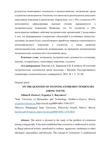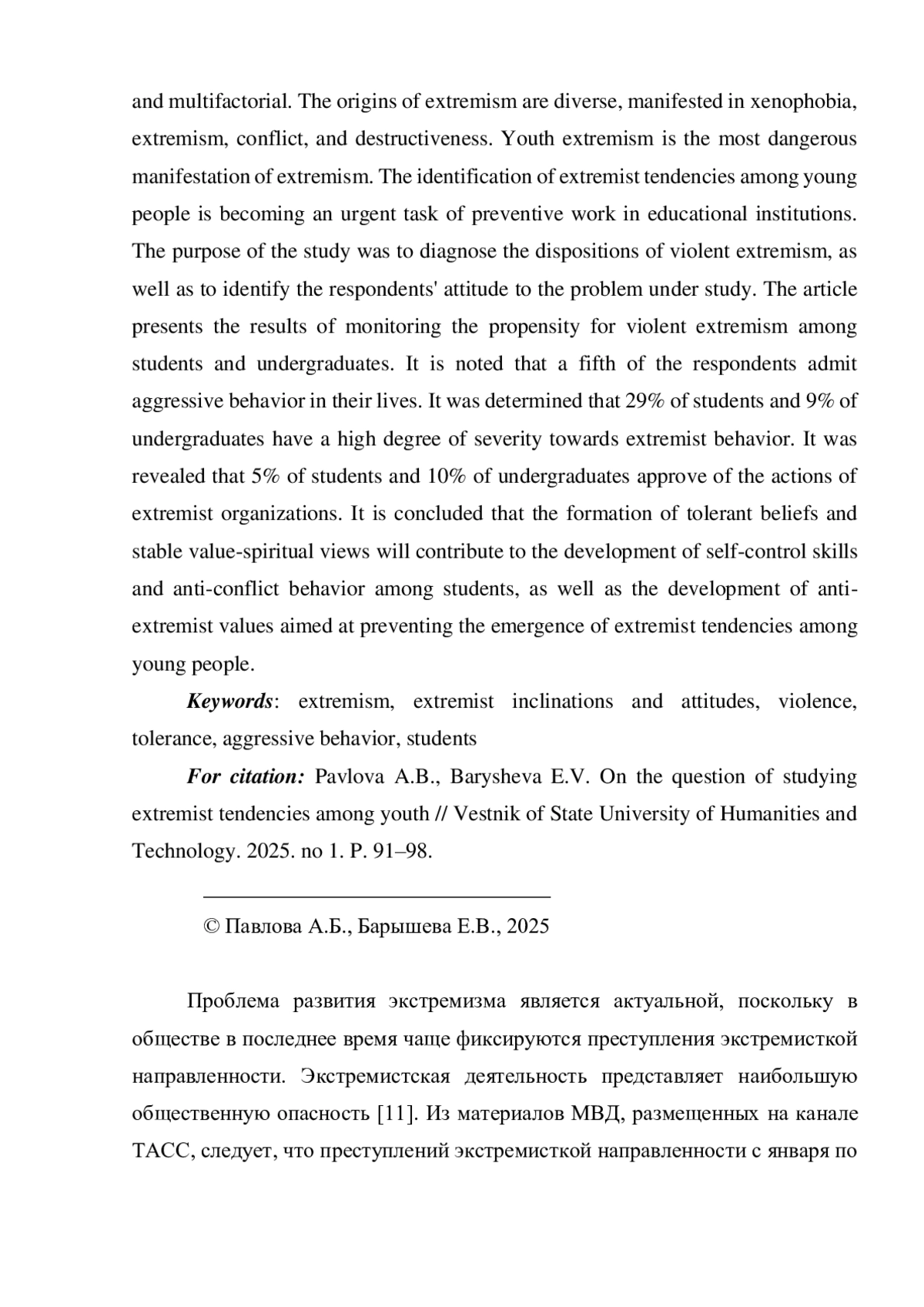 6. Садовская В.С., Ремизов В.А., Есаков В.А. Экстремизм: сущность и профилактика среди молодежи России // Вестник Московского государственного университета культуры и искусств. 2024. № 4 (120). С. 47-54. EDN: JEVZJJ