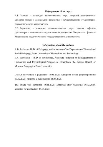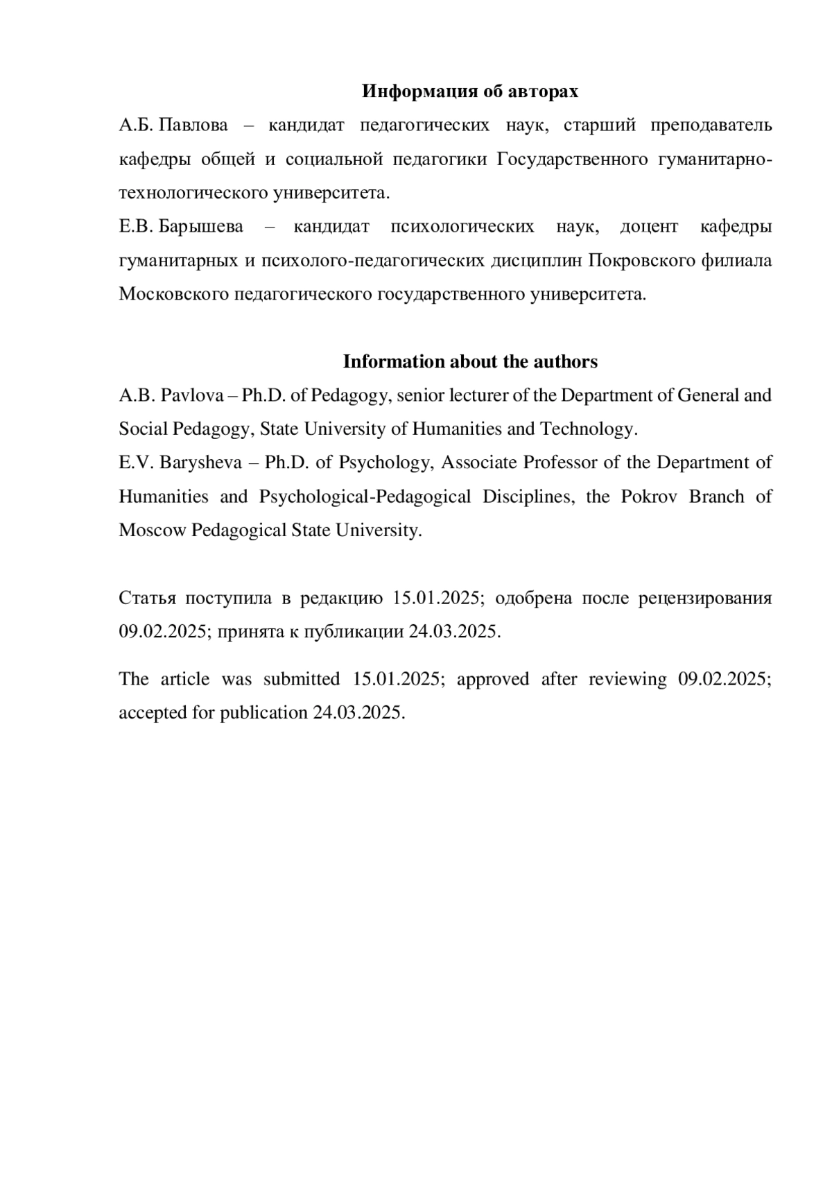 4. Павлова А.Б., Барышева Е.В., Ларин А.Н. Педагогическая профилактика девиантного поведения обучающихся образовательных организаций: монография / отв. ред. А.Б. Павлова. М.: Московский педагогический государственный университет, 2024. 180 с. EDN: CLFYVG