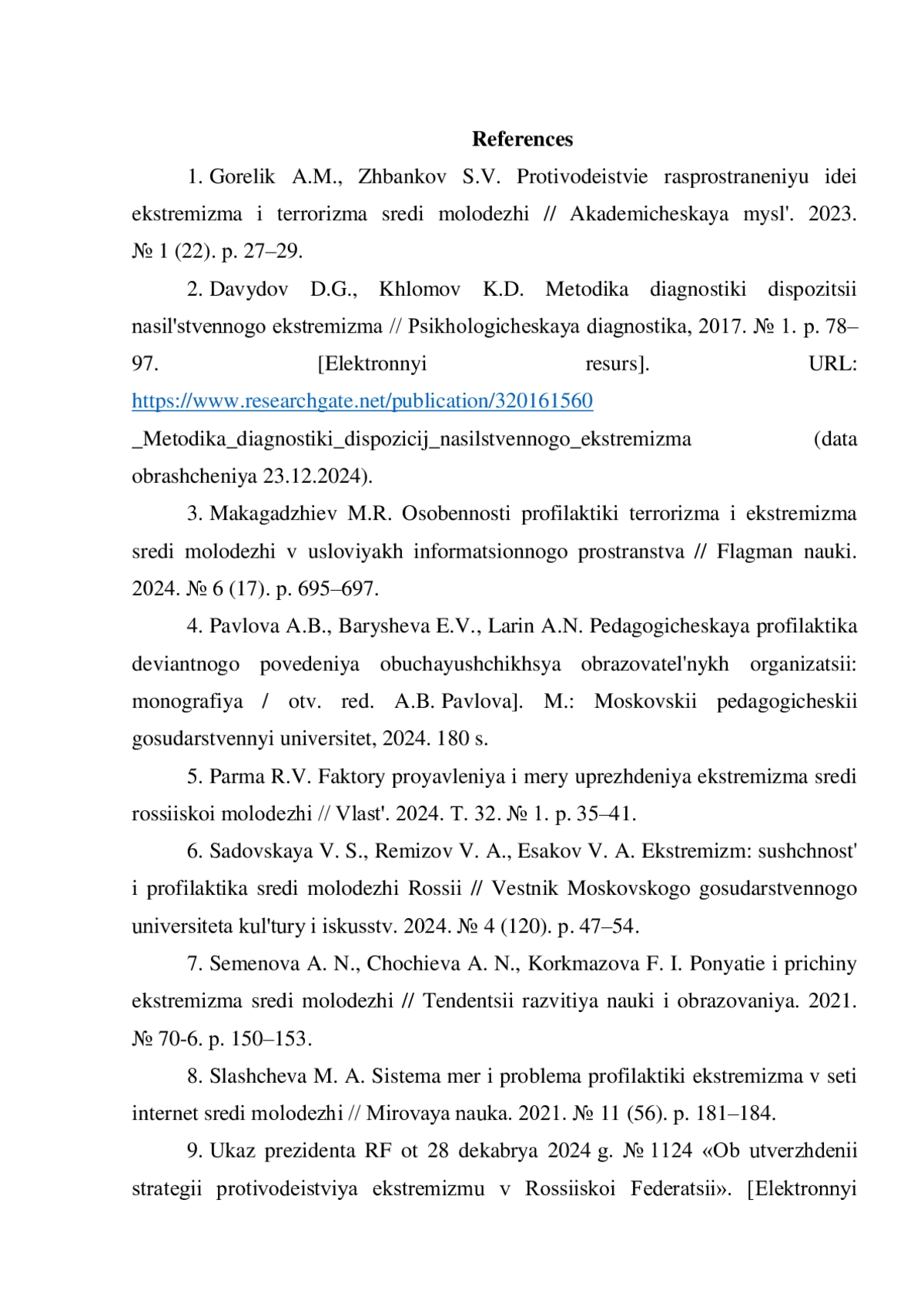 2. Давыдов Д.Г., Хломов К.Д. Методика диагностики диспозиций насильственного экстремизма / Психологическая диагностика, 2017. № 1. С. 78-97. [Электронный ресурс]. URL: https://www.researchgate.net/publication/320161560_Metodika_diagnostiki_dispozicij_nasilstvennogo_ekstremizma(датаобращения23.12.2024). EDN: ZWRAQT