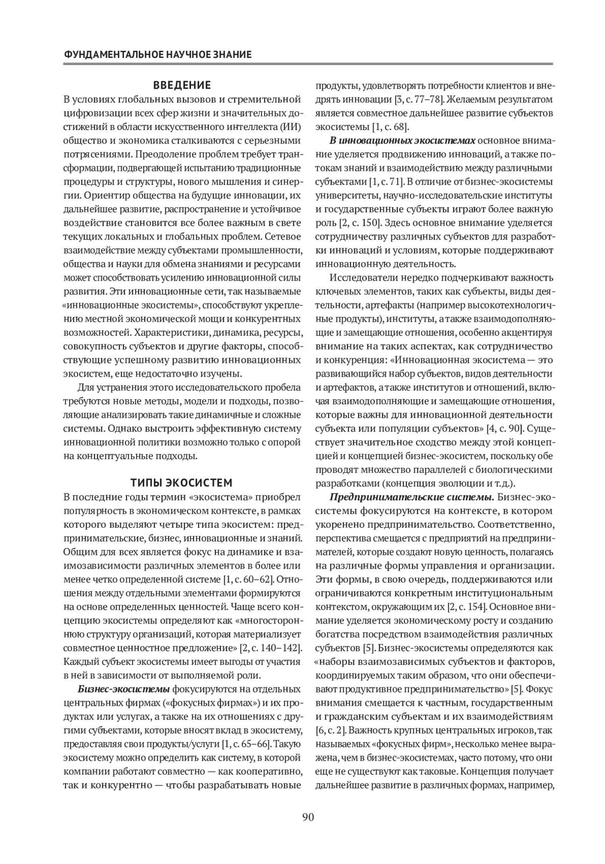 Целью данной статьи является проведение аналитического обзора предметного поля исследования, связанного с понятием «экосистема», а также предоставление анализа и дифференциации распространенных типов экосистем в соответствии с их основными целями и выявление их ключевых характеристик. На основе обобщения обширного корпуса источников в работе описываются ключевые элементы и роли в экосистемах, исследуется их значимость для функционирования, а также анализируются внешние факторы, оказывающие существенное влияние на проектирование экосистем. Особое внимание уделяется тому, что механизмы управления экосистемами включают формальные и неформальные сети, политические и экономические рамки, а также культурную и социальную среду. Эти компоненты образуют основу экосистемы и оказывают влияние на ее развитие и управление. В заключении выделяются ключевые факторы, способствующие оптимизации развития экосистем. К ним относятся определенное разнообразие элементов в экосистеме; плотные сети для содействия обмену и сотрудничеству; организатор, обеспечивающий поддержание услуг и поддержку взаимодействия между заинтересованными сторонами; эффективная нормативная база; достаточные ресурсы; поддерживающий образ мышления; гибкое управление.
