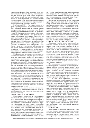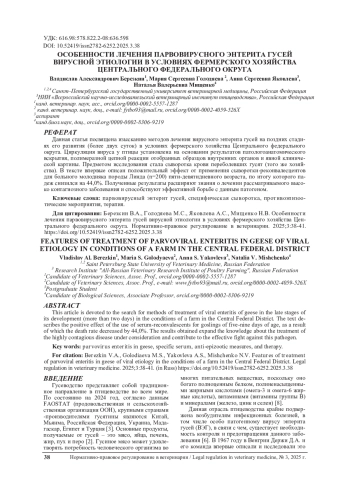Данная статья посвящена изысканию методов лечения вирусного энтерита гусей на поздних стадиях его развития (более двух суток) в условиях фермерского хозяйства Центрального федерального округа. Циркуляция вируса у птицы установлена на основании результатов патологоанатомического вскрытия, полимеразной цепной реакции отобранных образцов внутренних органов и явной клинической картины. Предметом исследования стала сыворотка крови переболевших гусят (того же хозяйства). В тексте впервые описан положительный эффект от применения сыворотки-реконвалесцентов для больного молодняка породы Линда (n=200) пяти-девятидневного возраста, по итогу которого падеж снизился на 44,0%. Полученные результаты расширяют знания о лечении рассматриваемого высоко контагиозного заболевания и способствуют эффективной борьбе с данным патогеном.