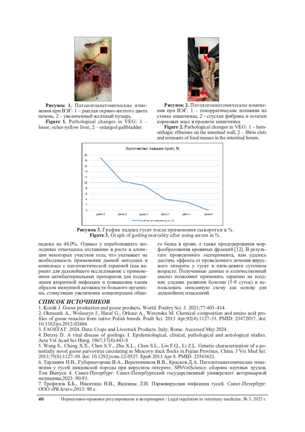 6. Тарлавин Н.В., Губернаторова В.А., Веретенников В.В., Красков Д.А. Патологоанатомические изменения у гусей линдовской породы при вирусном энтерите. SPbVetScience: сборник научных трудов. Том Выпуск 4. Cанкт-Петербург: Санкт-Петербургский государственный университет ветеринарной медицины;2023: 90-93.