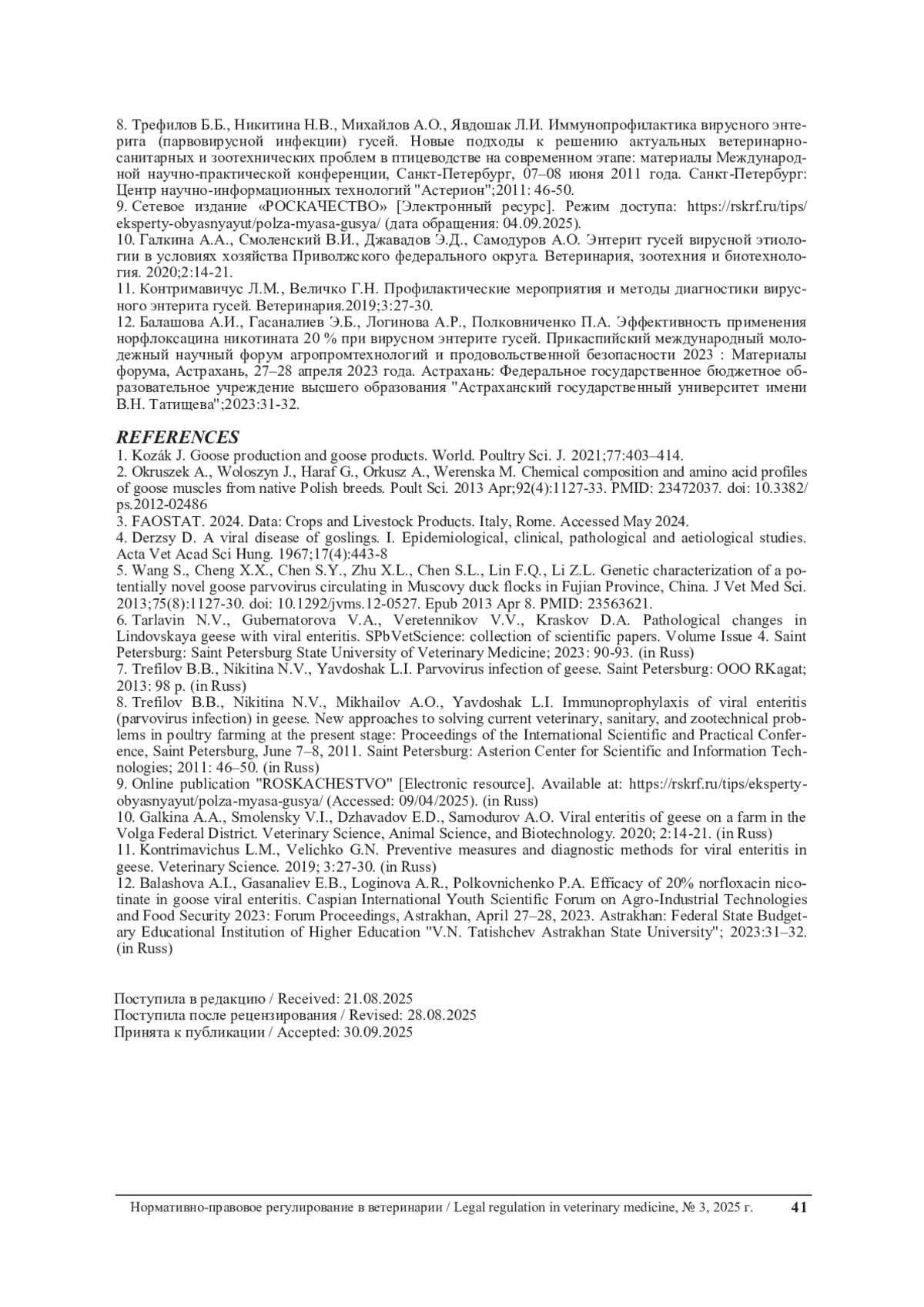 10. Галкина А.А., Смоленский В.И., Джавадов Э.Д., Самодуров А.О. Энтерит гусей вирусной этиологии в условиях хозяйства Приволжского федерального округа. Ветеринария, зоотехния и биотехнология. 2020;2:14-21.